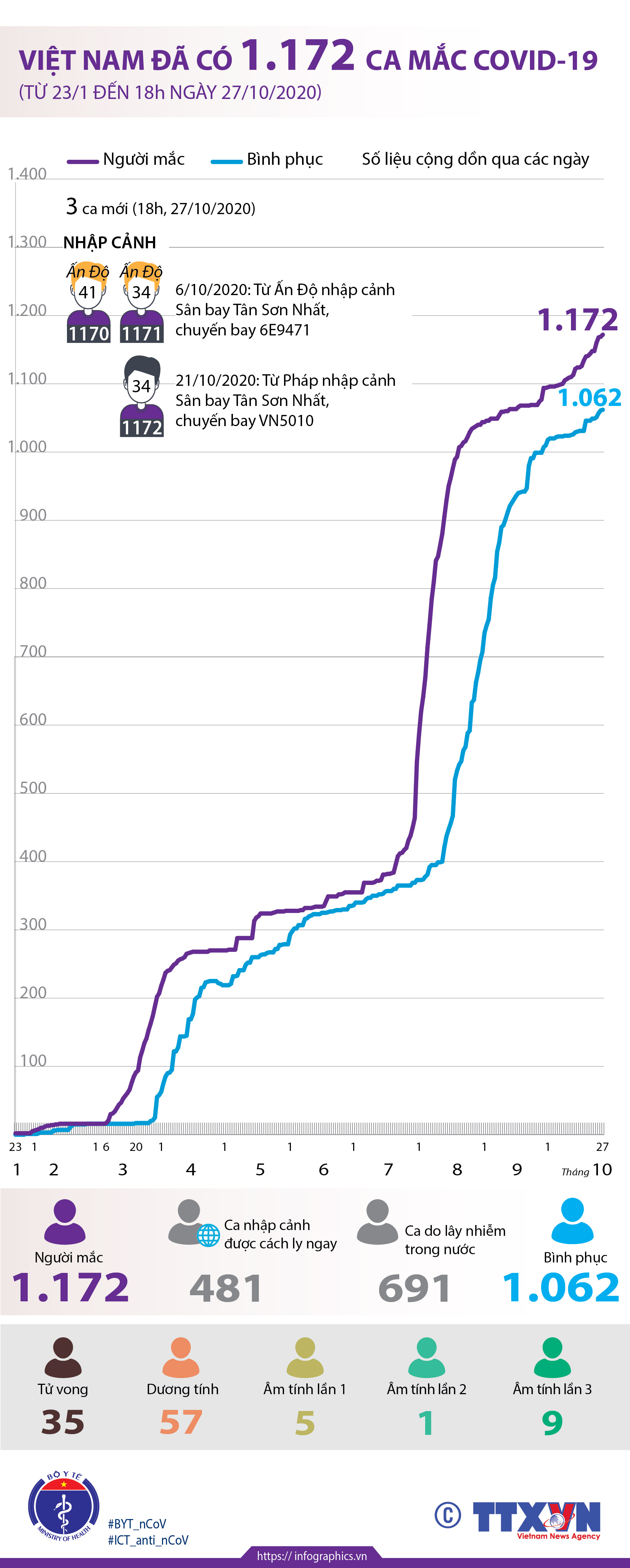 Tính đến 18h ngày 27/10/2020, Việt Nam đã ghi nhận 1.172 ca mắc COVID-19.