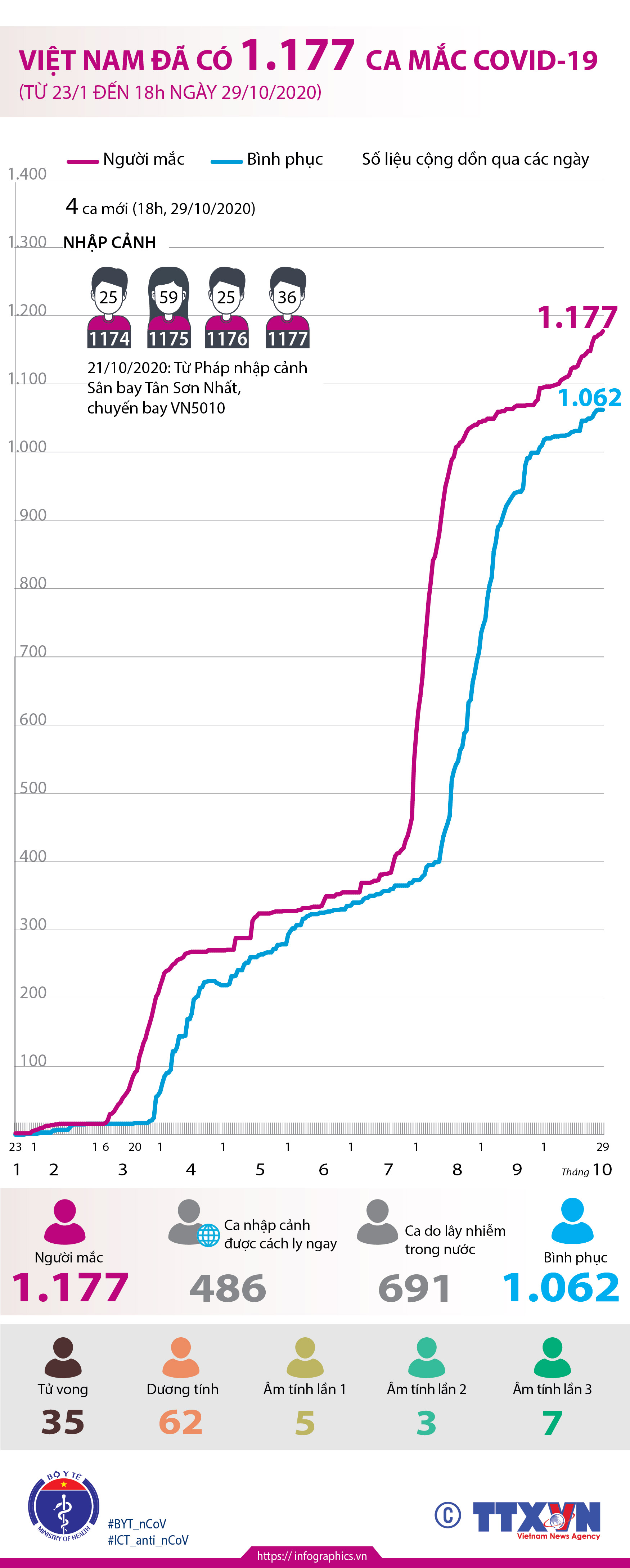 Tính đến 18h ngày 29/10/2020, Việt Nam đã ghi nhận 1.177 ca mắc COVID-19.