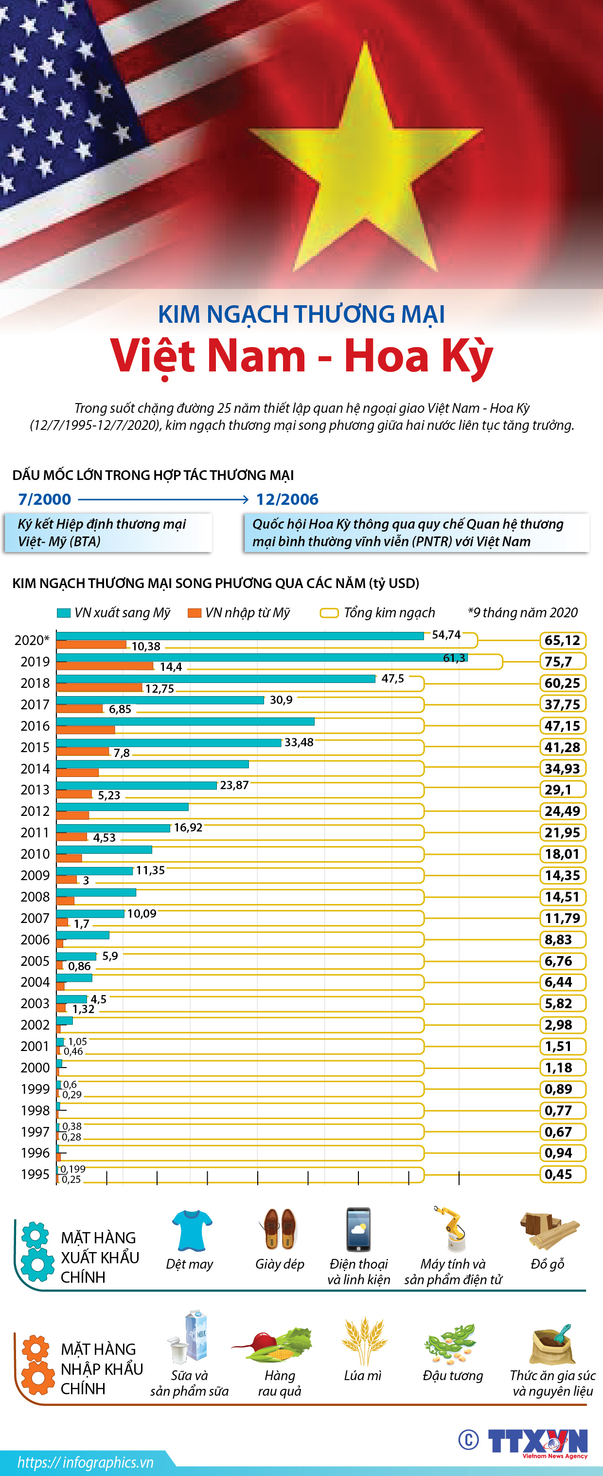 Trong suốt chặng đường 25 năm thiết lập quan hệ ngoại giao, kim ngạch thương mại song phương giữa Việt Nam và Hoa Kỳ tăng trưởng mạnh mẽ, là một điểm sáng trong quan hệ giữa hai nước,