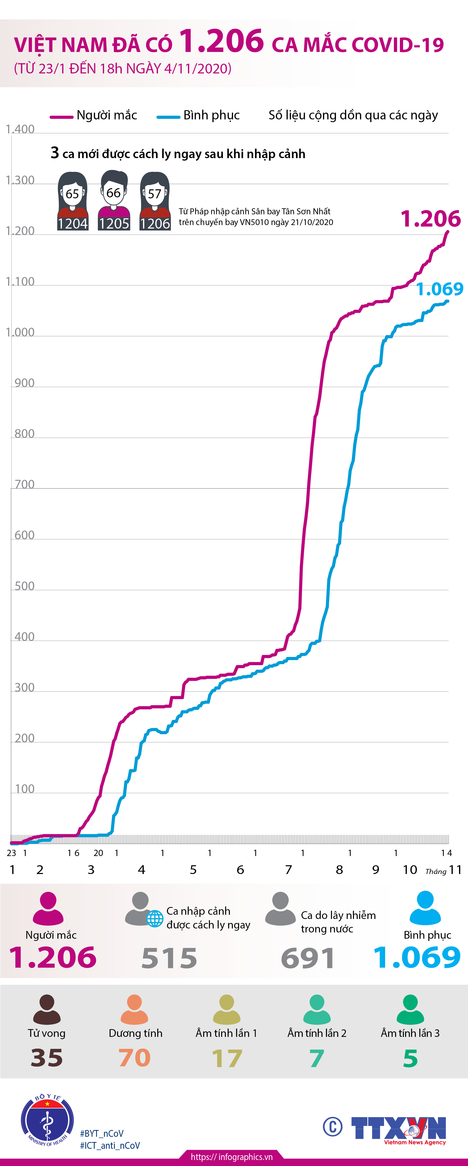 Tính đến 18h ngày 4/11/2020, Việt Nam đã ghi nhận 1.206 ca mắc COVID-19.