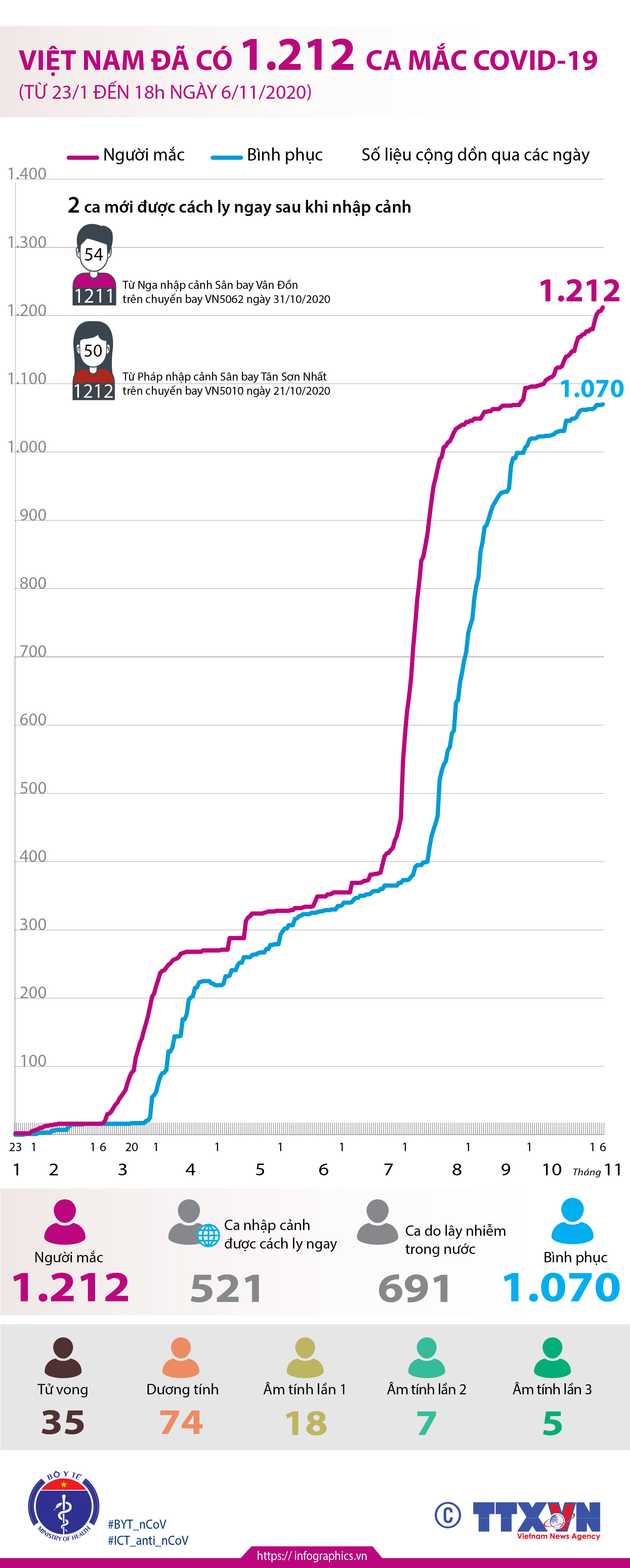 Tính đến 18h ngày 6/11/2020, Việt Nam đã ghi nhận 1.212 ca mắc COVID-19.