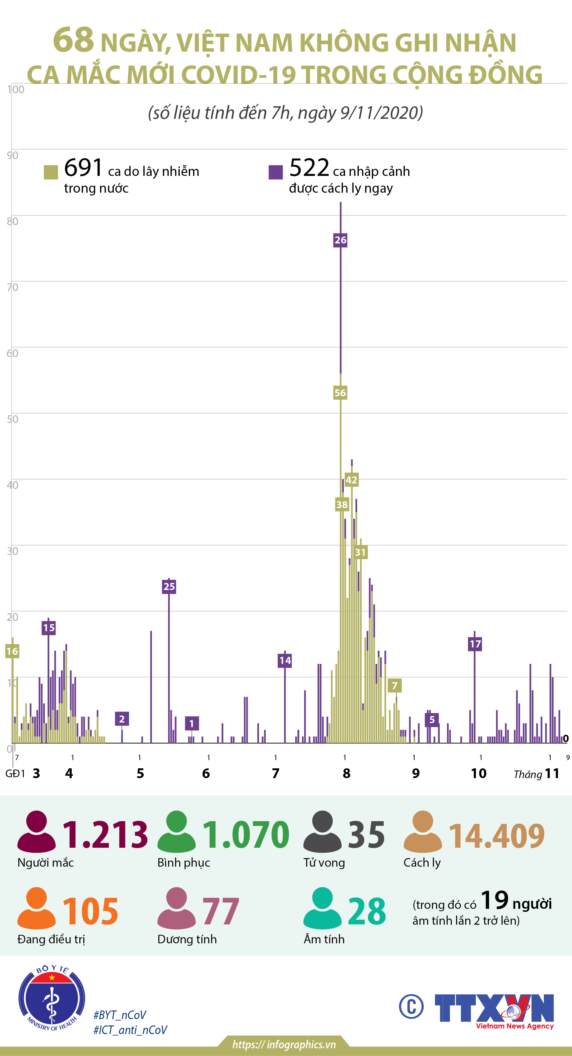 68 ngày, Việt Nam không ghi nhận ca mắc COVID-19 trong cộng đồng (tính đến 7h, ngày 9/11/2020)