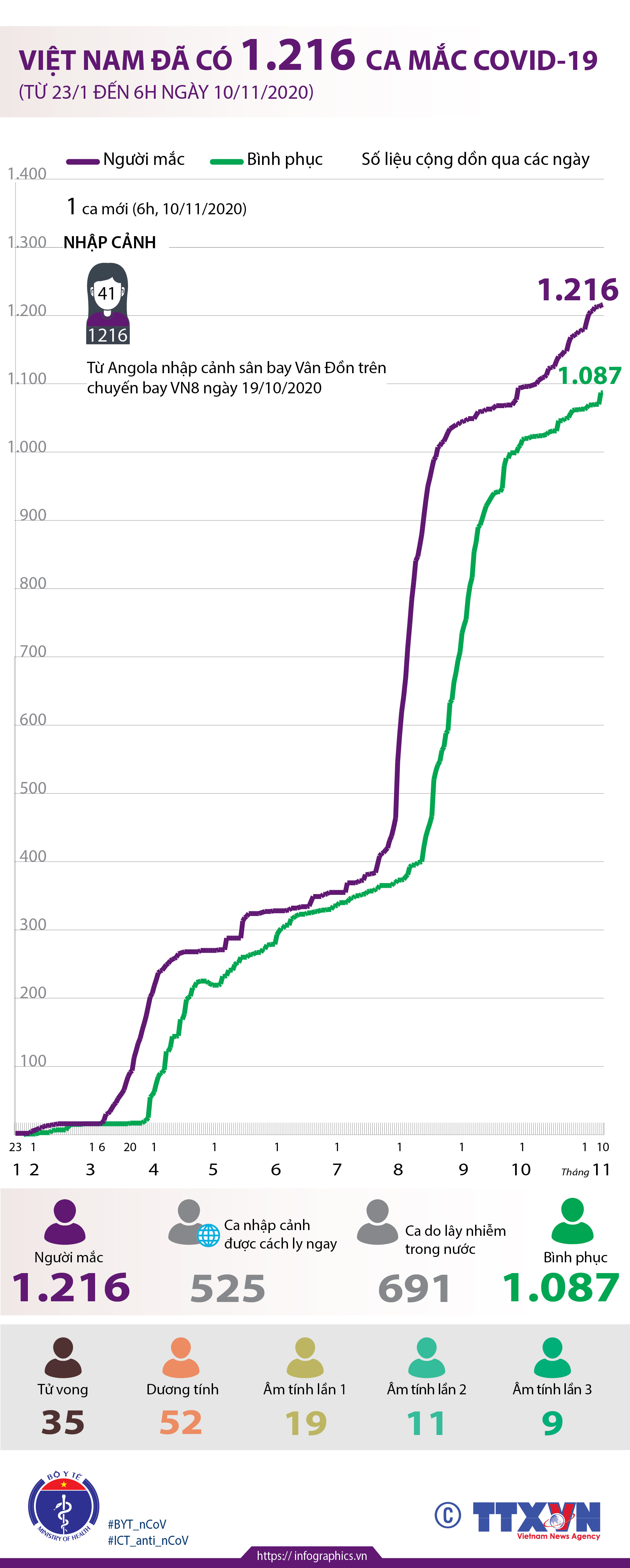 Tính đến 6h ngày 10/11/2020, Việt Nam đã ghi nhận 1.216 ca mắc COVID-19.