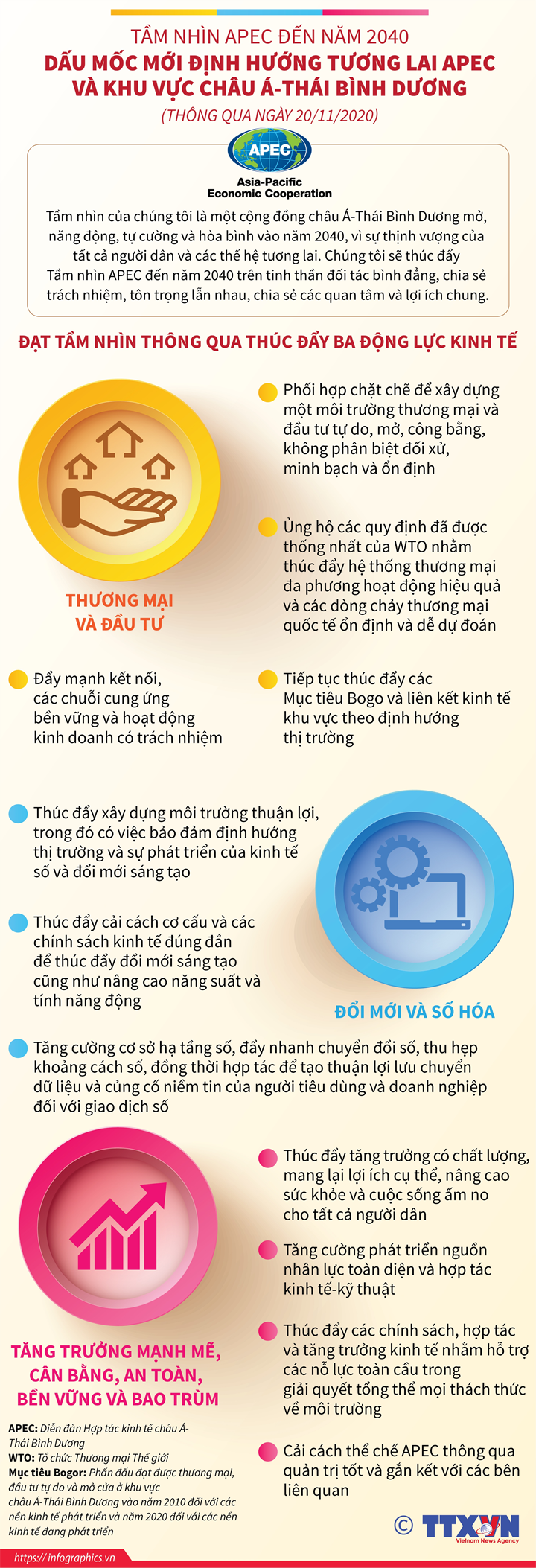 Tại Hội nghị Cấp cao APEC lần thứ 27, các nhà lãnh đạo đã thông qua Tầm nhìn đến năm 2040 về một cộng đồng châu Á- Thái Bình Dương mở, năng động, tự cường và hòa bình, vì sự thịnh vượng của tất cả người dân và các thế hệ tương lai, trong đó APEC tiếp tục là diễn đàn hợp tác kinh tế hàng đầu khu vực.