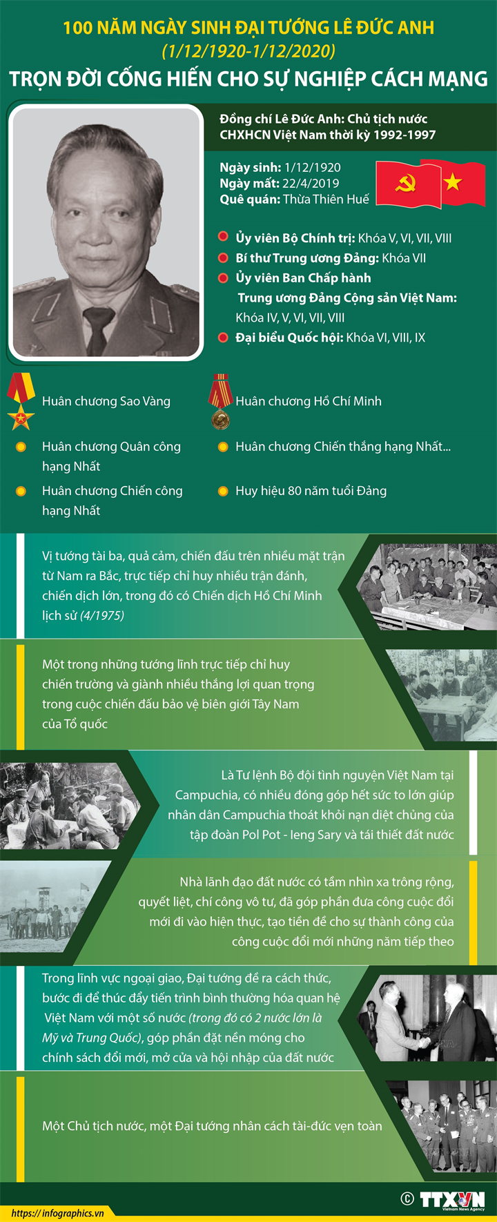 Với 99 năm tuổi đời, 80 năm tuổi Đảng, Chủ tịch nước, Đại tướng Lê Đức Anh đã cống hiến trọn đời cho sự nghiệp cách mạng vẻ vang của Đảng và nhân dân ta. Ngày 1/12/2020 là kỷ niệm 100 năm ngày sinh của Đại tướng Lê Đức Anh (1/12/1920-1/12/2020), nguyên Chủ tịch nước CHXHCN Việt Nam