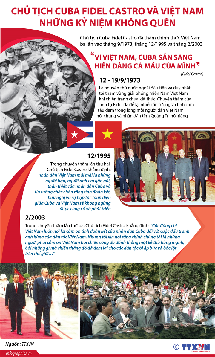 Vị lãnh tụ huyền thoại của Cuba - Fidel Castro là nguyên thủ quốc gia đi đầu trong phong trào quốc tế ủng hộ cuộc đấu tranh chính nghĩa của nhân dân Việt Nam vì độc lập dân tộc và thống nhất đất nước trước đây, cũng như trong sự nghiệp tái thiết, xây dựng và bảo vệ Tổ quốc sau này. Nhân kỷ niệm 60 năm ngày thiết lập quan hệ ngoại giao giữa 2 nước (2/12/1960 - 2/12/2020), cùng nhìn lại 3 chuyến thăm chính thức Việt Nam của Chủ tịch Cuba Fidel Castro