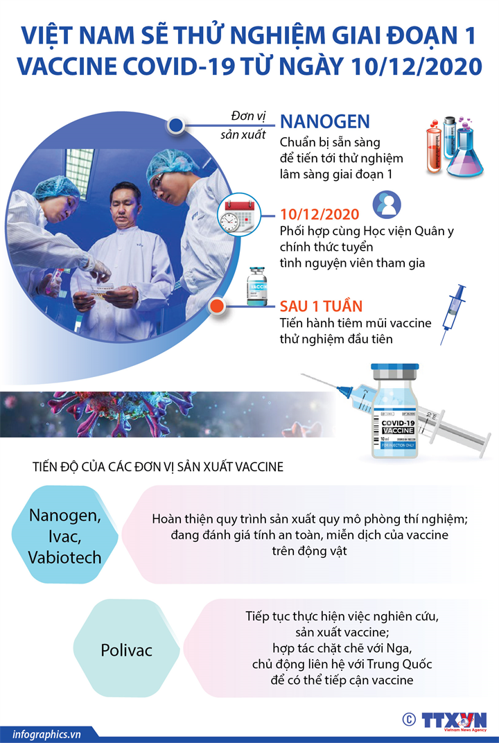 Đến thời điểm này, các nhà sản xuất vaccine COVID-19 trong nước đang nỗ lực đẩy mạnh tiến độ triển khai nghiên cứu tiến tới thử nghiệm tiền lâm sàng. Từ ngày 10/12/2020 tới đây, Việt Nam sẽ thử nghiệm giai đoạn 1 vaccine COVID-19.