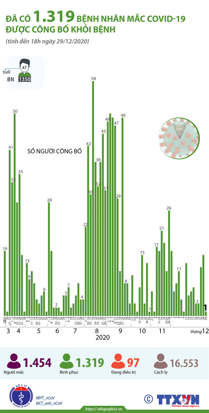 Tính đến 18h ngày 29/12/2020, đã có 1.319 bệnh nhân mắc COVID-19 được công bố khỏi bệnh.