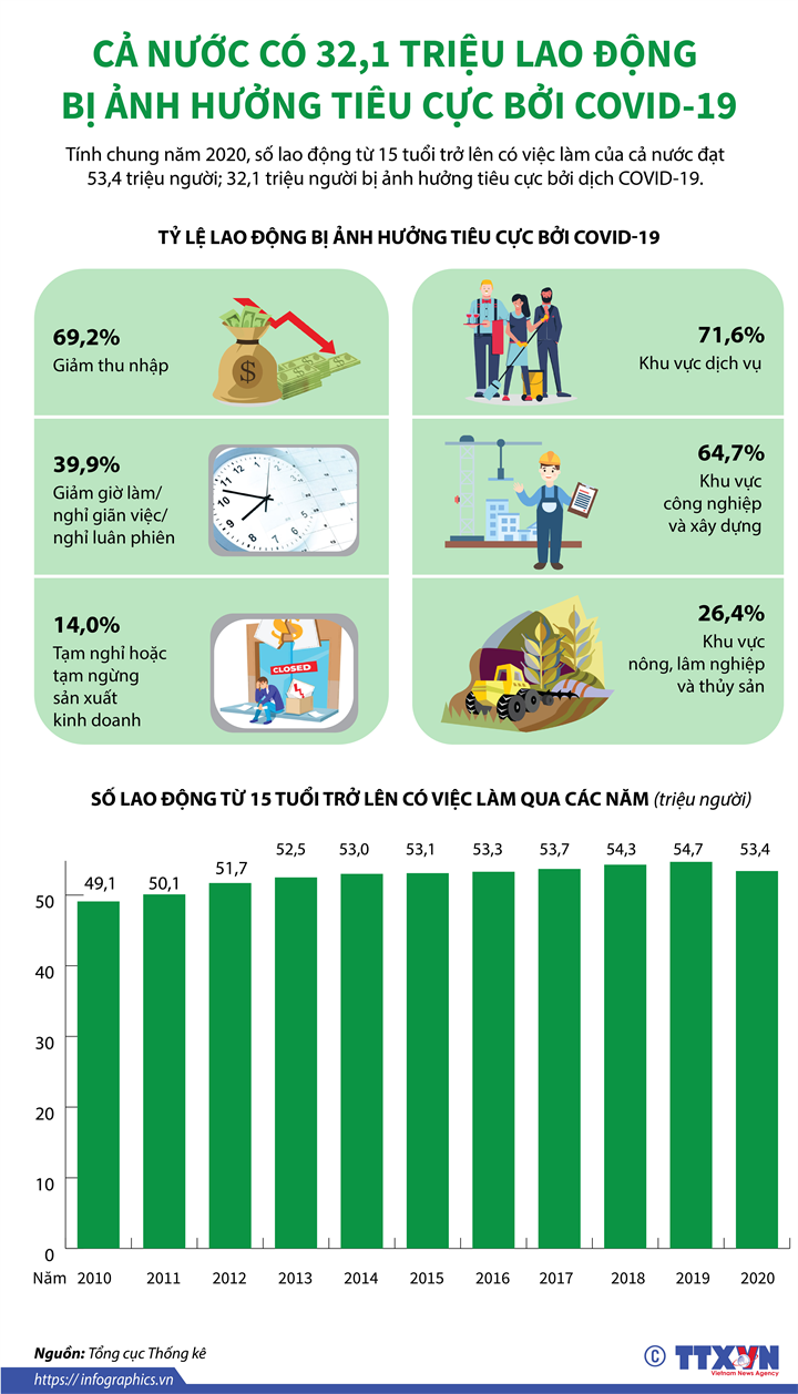 Tính chung năm 2020, số lao động từ 15 tuổi trở lên có việc làm của cả nước đạt 53,4 triệu người; 32,1 triệu người bị ảnh hưởng tiêu cực bởi dịch COVID-19.