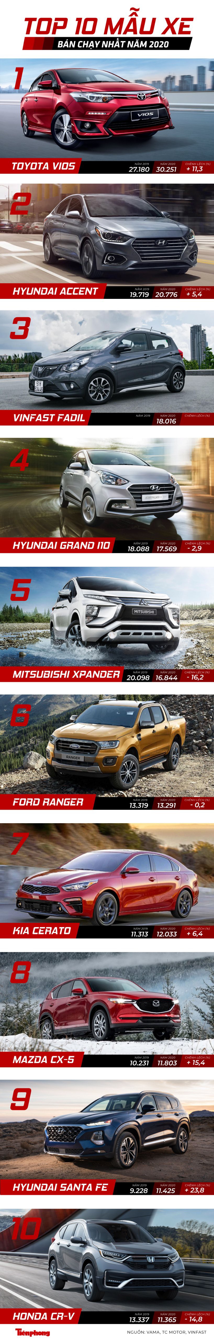 Trong năm 2020, danh sách 10 mẫu xe bán chạy nhất thị trường ôtô Việt Nam đã có nhiều thay đổi so với năm trước đó, đặc biệt là VinFast Fadil đã vươn lên xếp trong top đầu.