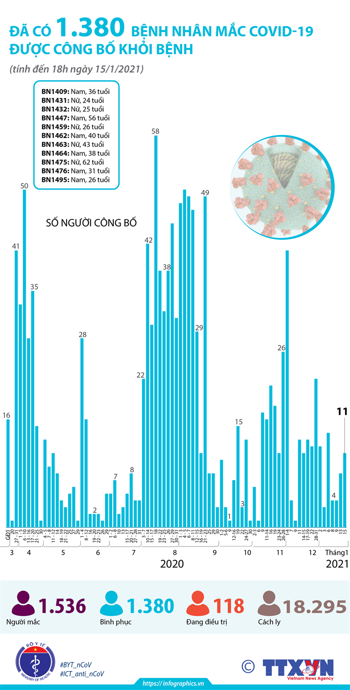 Tính đến 18h ngày 15/1/2021, đã có 1.380 bệnh nhân mắc COVID-19 được công bố khỏi bệnh.