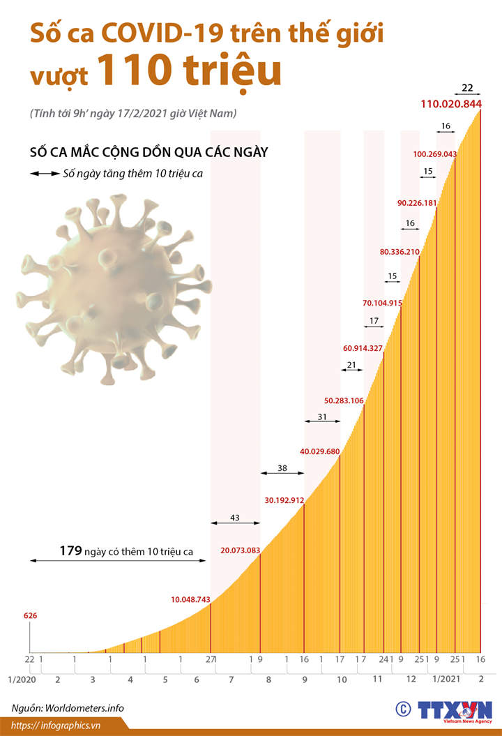 Số ca mắc COVID-19 trên thế giới đã vượt mốc 110 triệu ca, 22 ngày sau khi vượt 100 triệu ca.