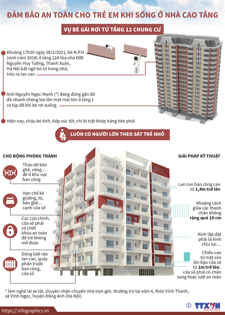 Mới đây, tại Hà Nội đã xảy ra vụ một bé gái bò ra khỏi căn hộ chung cư tầng 12, trèo ra lan can nhưng may mắn được người cứu khi rơi xuống. Để đảm bảo an toàn cho trẻ em khi sống ở nhà cao tầng, người lớn luôn phải theo sát trẻ nhỏ và chủ động phòng tránh rủi ro cho các bé.