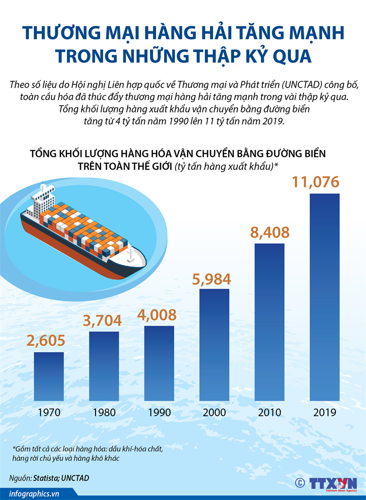 Theo số liệu do Hội nghị Liên hợp quốc về Thương mại và Phát triển (UNCTAD) công bố, toàn cầu hóa đã thúc đẩy thương mại hàng hải tăng mạnh trong vài thập kỷ qua. Tổng khối lượng hàng xuất khẩu vận chuyển bằng đường biển tăng từ 4 tỷ tấn năm 1990 lên 11 tỷ tấn năm 2019.
