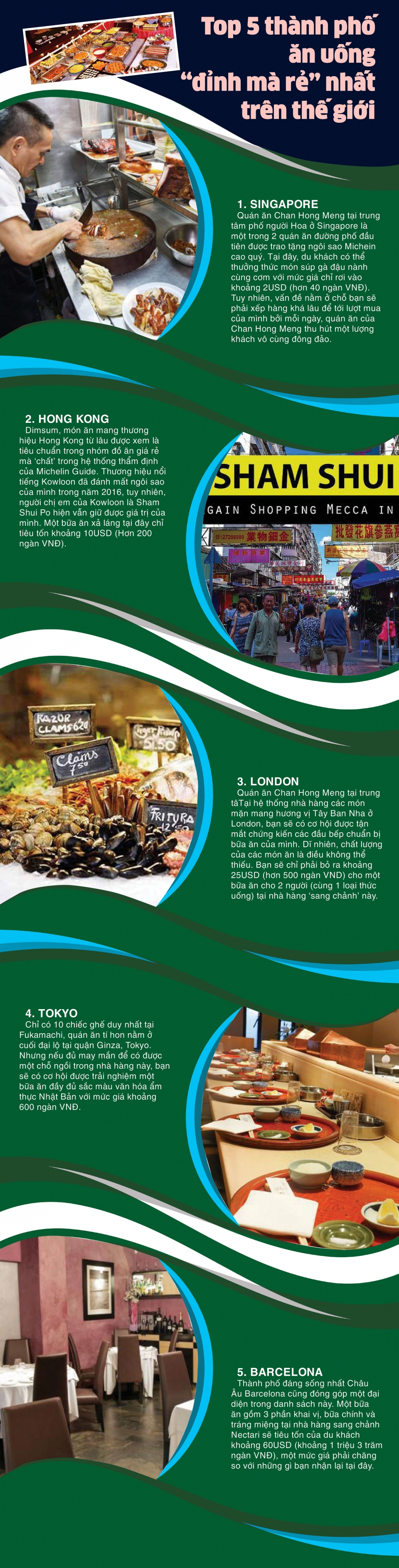 Singapore, Hong Kong hay London đều được biết đến như những điểm du lịch đắt đỏ nhất trên thế giới. Tuy nhiên, đây lại là 3 trong số 5 cái tên được đề cập trong danh sách những thành phố mang đến cho du khách những trải nghiệm về ẩm thực vừa tuyệt hảo lại vừa không ngốn nhiều “ngân sách”.