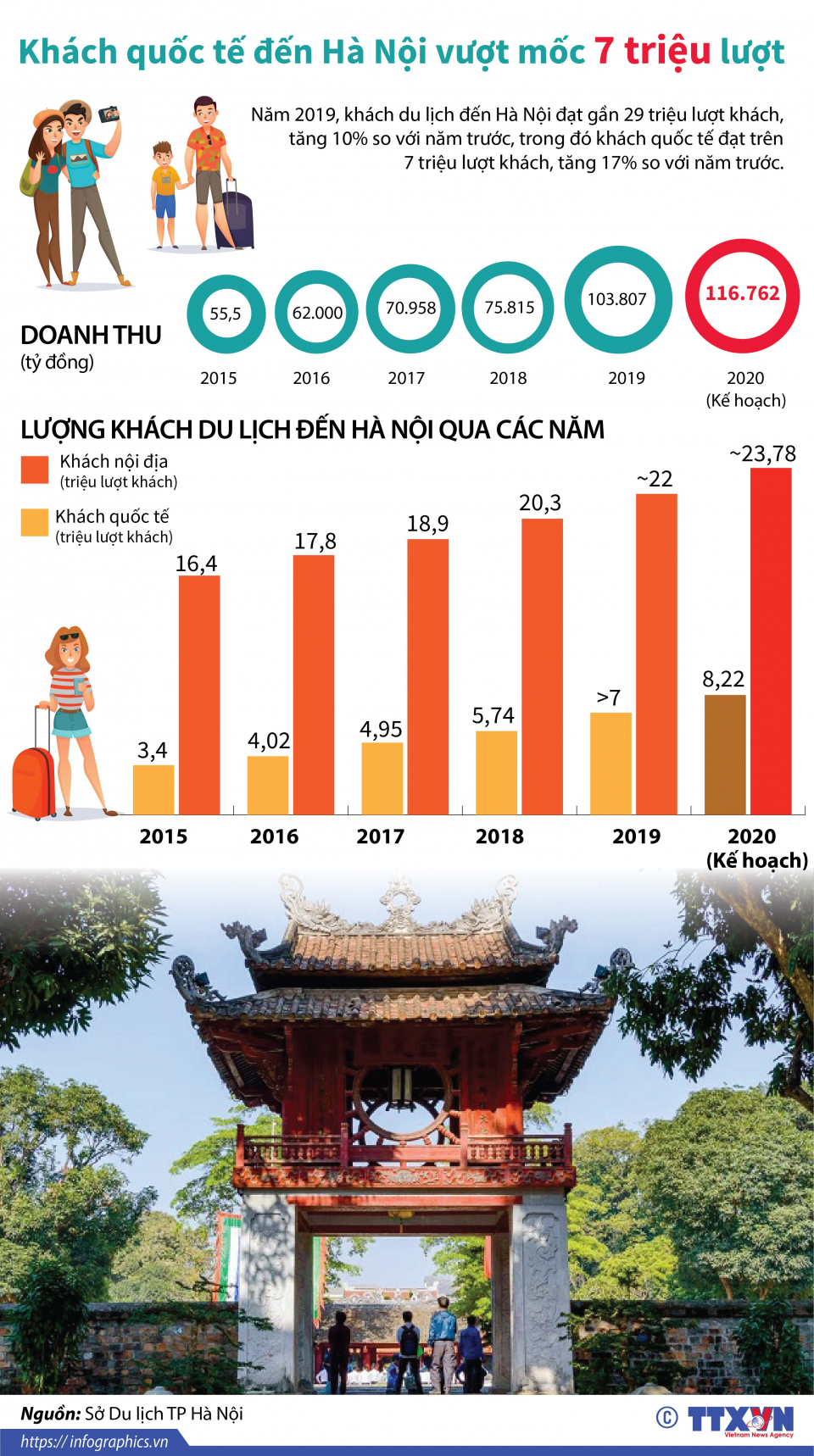 Năm 2019, khách du lịch đến Hà Nội đạt gần 29 triệu lượt khách, tăng 10% so với năm trước, trong đó khách quốc tế đạt trên 7 triệu lượt khách, tăng 17% so với năm trước.