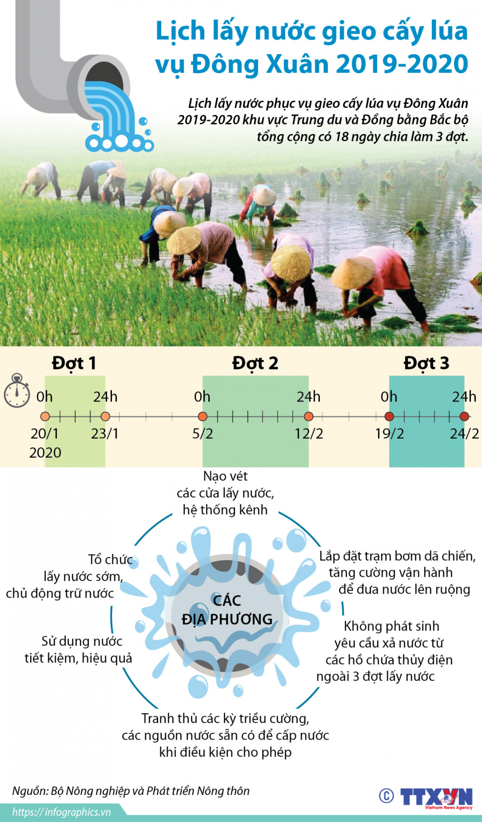 Lịch lấy nước phục vụ gieo cấy lúa vụ Đông Xuân 2019-2020 khu vực Trung du và Đồng bằng Bắc bộ tổng cộng có 18 ngày chia làm 3 đợt.