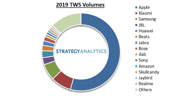 Cách đây ít ngày theo thống kê từ Strategy Analytics cho thấy Apple đã bán được đến 58,7 triệu chiếc AirPods (bao gồm cả AirPods Pro) vào năm 2019. Con số này tương đương với tỷ lệ 54,4% thị phần toàn thị trường True Wireless. Điều này đồng nghĩa với việc cứ 2 chiếc tai nghe True Wireless bán ra thị trường, thì có khoảng hơn 1 chiếc AirPods đến với người dùng trong năm ngoái.