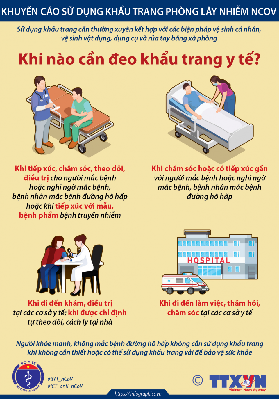 Những người tiếp xúc, chăm sóc, theo dõi, điều trị cho người mắc bệnh hoặc nghi ngờ mắc bệnh, bệnh nhân mắc bệnh đường hô hấp, đi đến khám, điều trị tại các cơ sở y tế; khi được chỉ định tự theo dõi, cách ly tại nhà…phải đeo khẩu trang y tế.