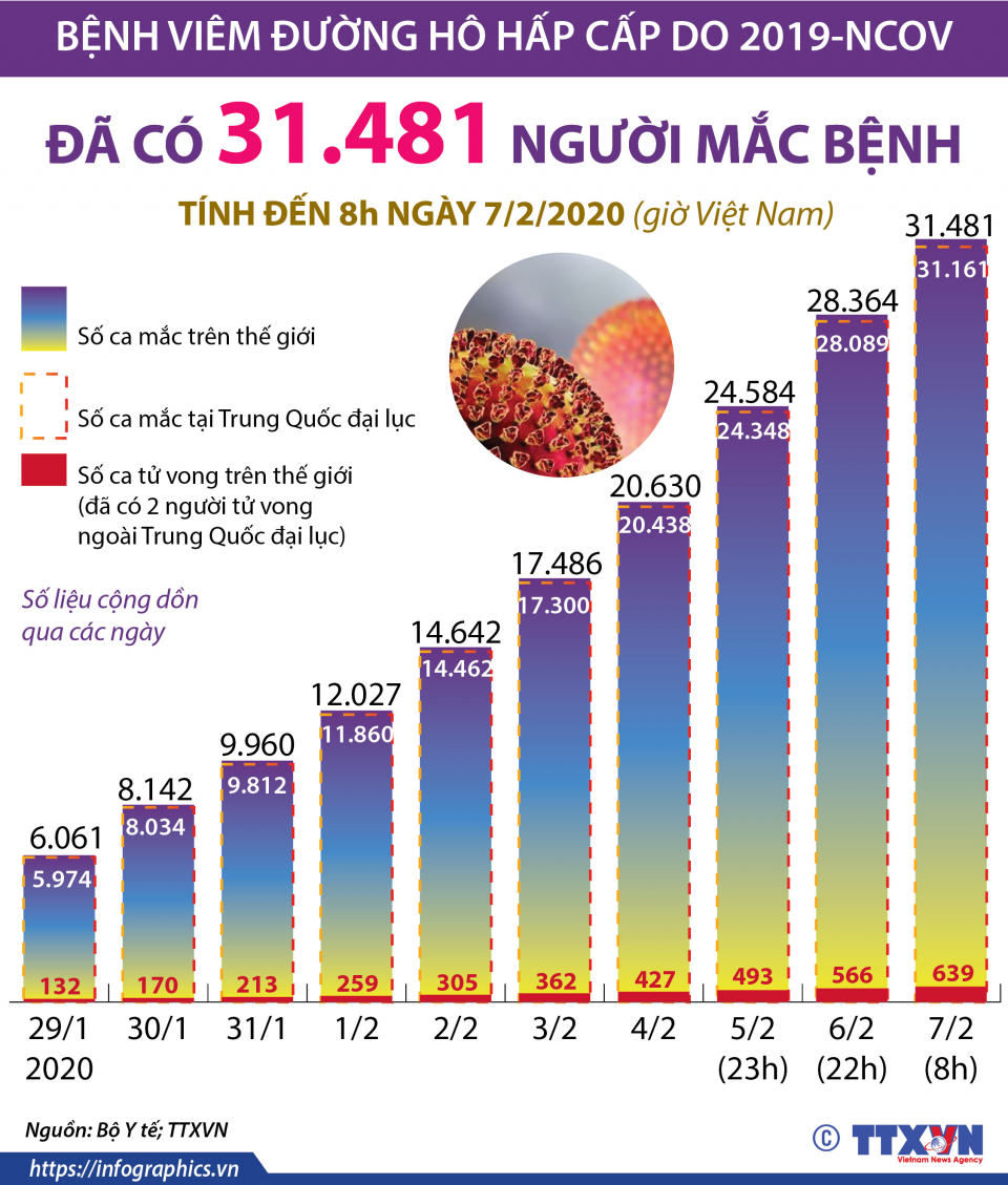 Tính đến 8h00 ngày 7/2/2020, đã có 31.481 ca mắc bệnh viêm đường hô hấp cấp do chủng mới của virus Corona (2019-nCoV) trên toàn thế giới và 639 người tử vong, trong đó 637 người tử vong ở Trung Quốc và 2 người tử vong ngoài Trung Quốc đại lục.