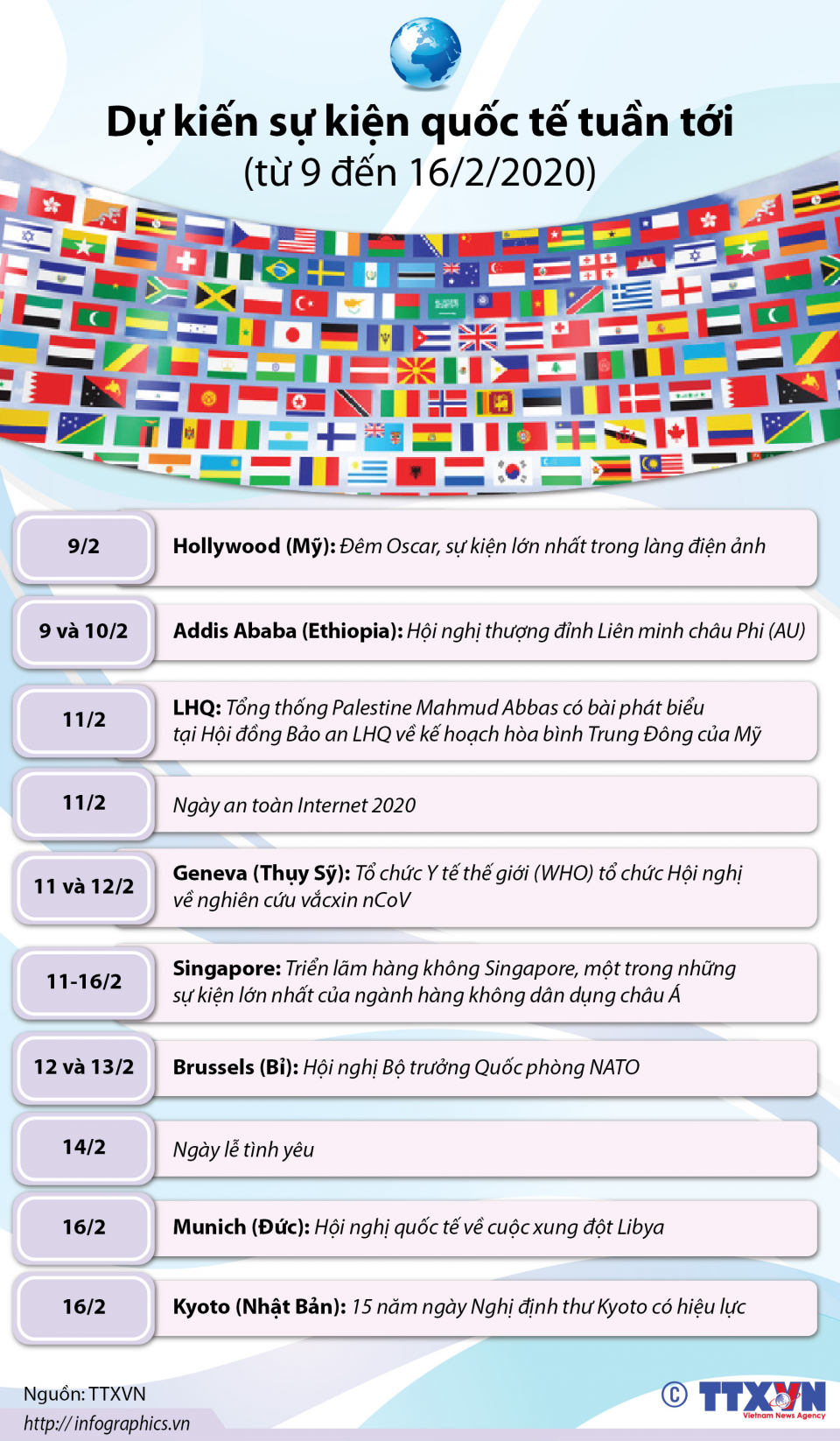 Trong tuần (từ ngày 9 đến 16/2/2020), trên thế giới sẽ diễn ra một số sự kiện như: Tổ chức Y tế thế giới (WHO) tổ chức Hội nghị về nghiên cứu vắcxin nCoV; Tổng thống Palestine phát biểu tại Hội đồng Bảo an LHQ về kế hoạch hòa bình Trung Đông của Mỹ; Đêm Oscar, sự kiện lớn nhất trong làng điện ảnh…