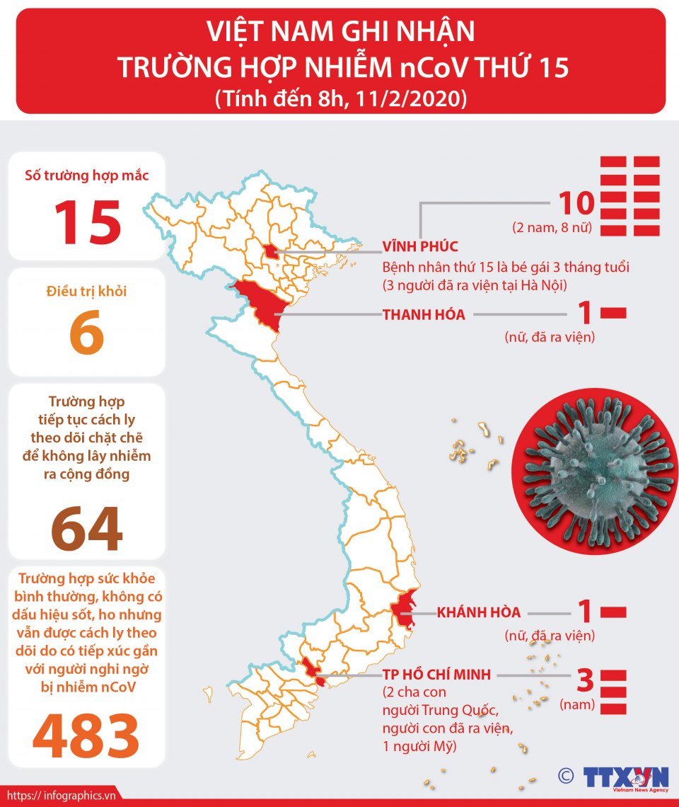 Sáng 11/2/2020, Bộ Y tế cho biết, Việt Nam ghi nhận thêm 1 trường hợp có kết quả xét nghiệm dương tính với chủng mới của virus Corona (nCoV), nâng tổng số trường hợp nhiễm nCoV tại Việt Nam lên 15.