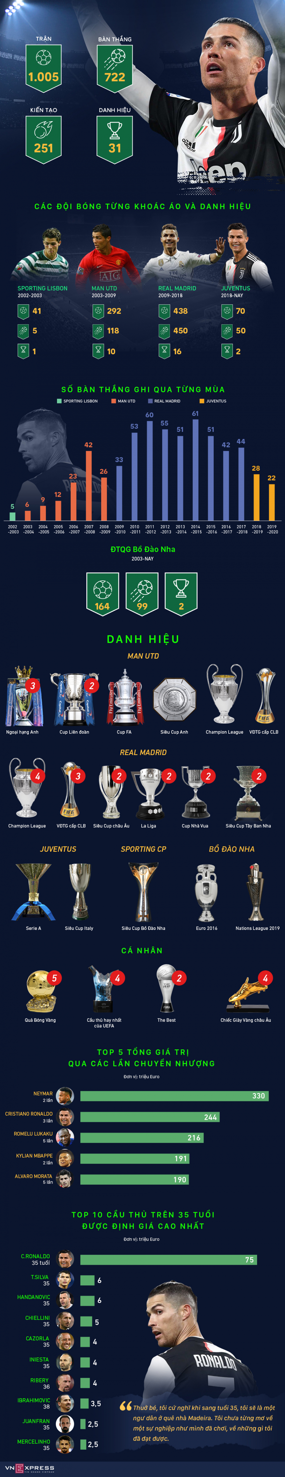 Cristiano Ronaldo sở hữu 31 danh hiệu tập thể, và được định giá cao nhất trong số cầu thủ từ 35 tuổi trở lên.