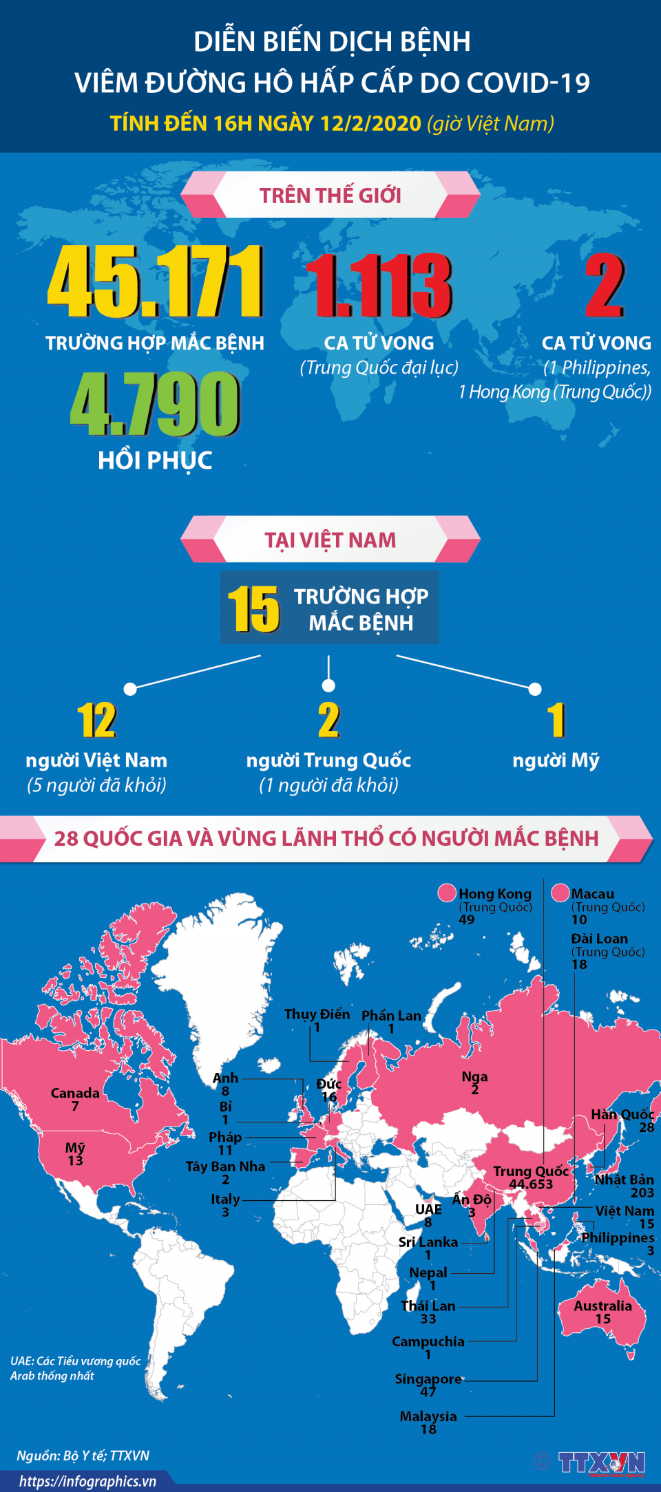 Đến 16h ngày 12/2/2020, đã có 45.171 ca mắc bệnh viêm đường hô hấp cấp do chủng mới của virus Corona (Covid-19) trên toàn thế giới và 1.115 người tử vong, trong đó 1.113 người tử vong ở Trung Quốc đại lục và 2 người tử vong ngoài Trung Quốc đại lục.