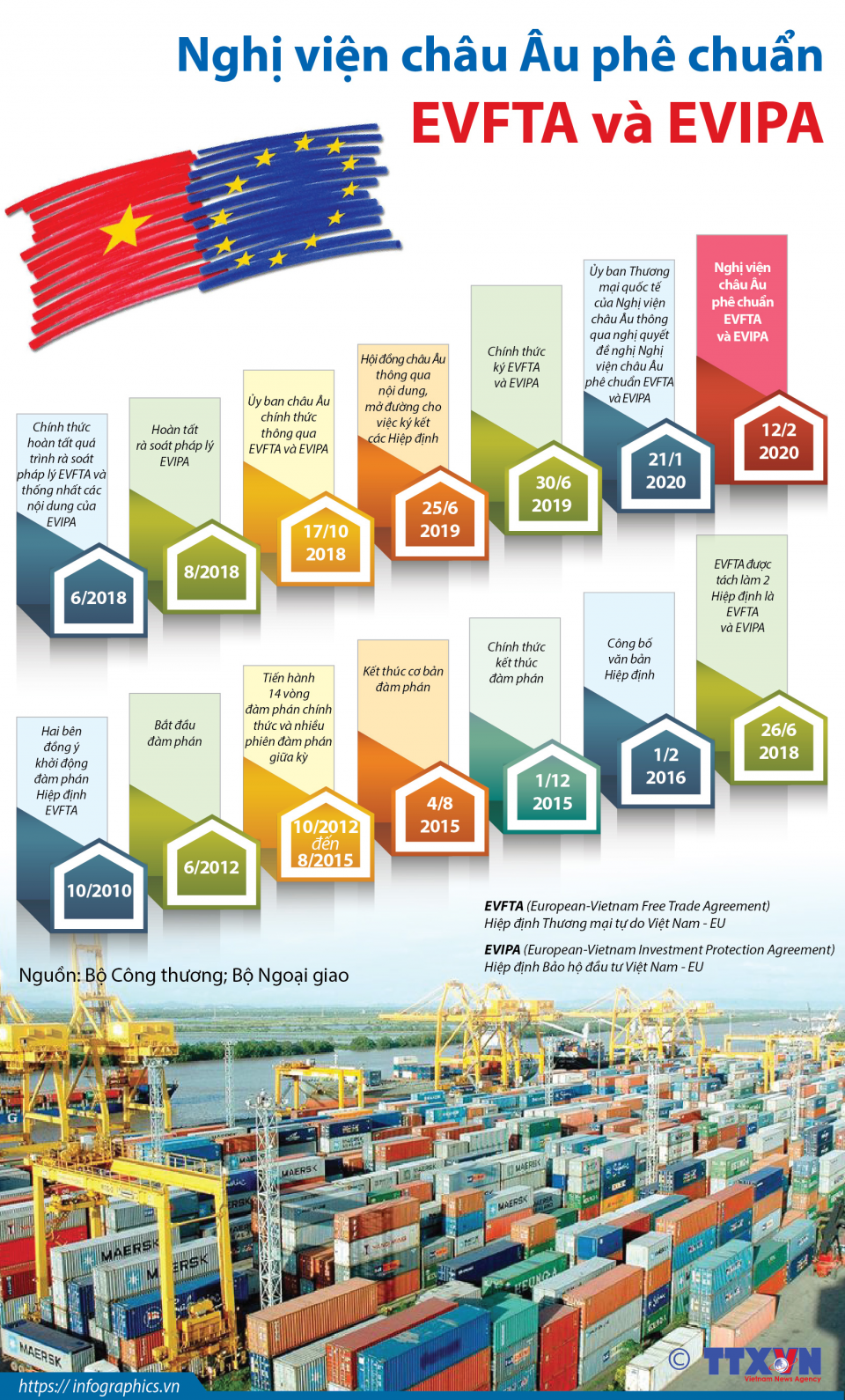 Chiều 12/2/2020 (theo giờ Việt Nam), Nghị viện châu Âu (EP) đã chính thức phê chuẩn Hiệp định thương mại tự do EVFTA và Hiệp định Bảo hộ đầu tư EVIPA giữa Việt Nam và Liên minh châu Âu (EU).