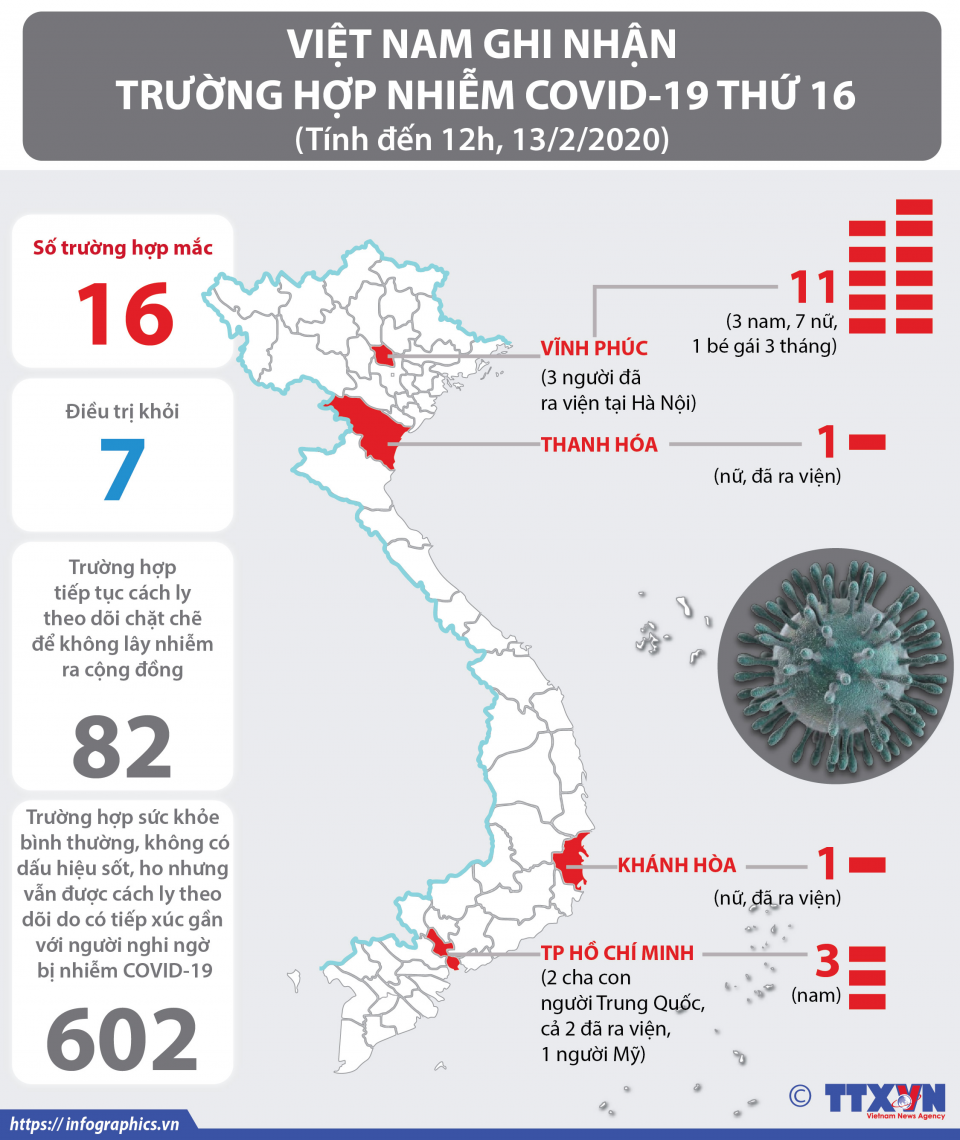 Ngày 13/2/2020, Việt Nam ghi nhận thêm 1 trường hợp có kết quả xét nghiệm dương tính với chủng mới của virus Corona (COVID-19), nâng tổng số trường hợp nhiễm COVID-19 tại Việt Nam lên 16.