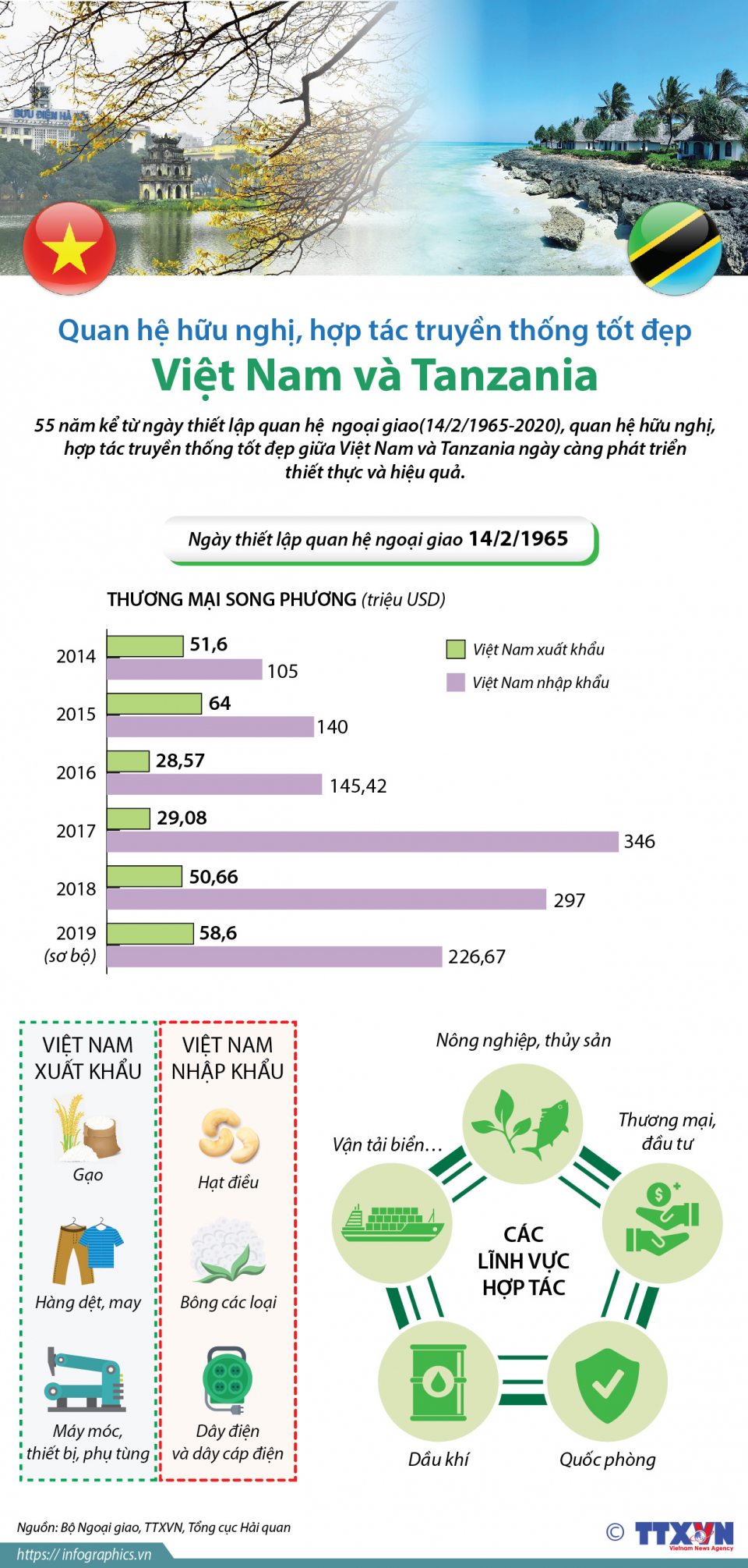 55 năm kể từ ngày thiết lập quan hệ ngoại giao(14/2/1965-2020), quan hệ hữu nghị, hợp tác truyền thống tốt đẹp giữa Việt Nam và Tanzania ngày càng phát triển thiết thực và hiệu quả.