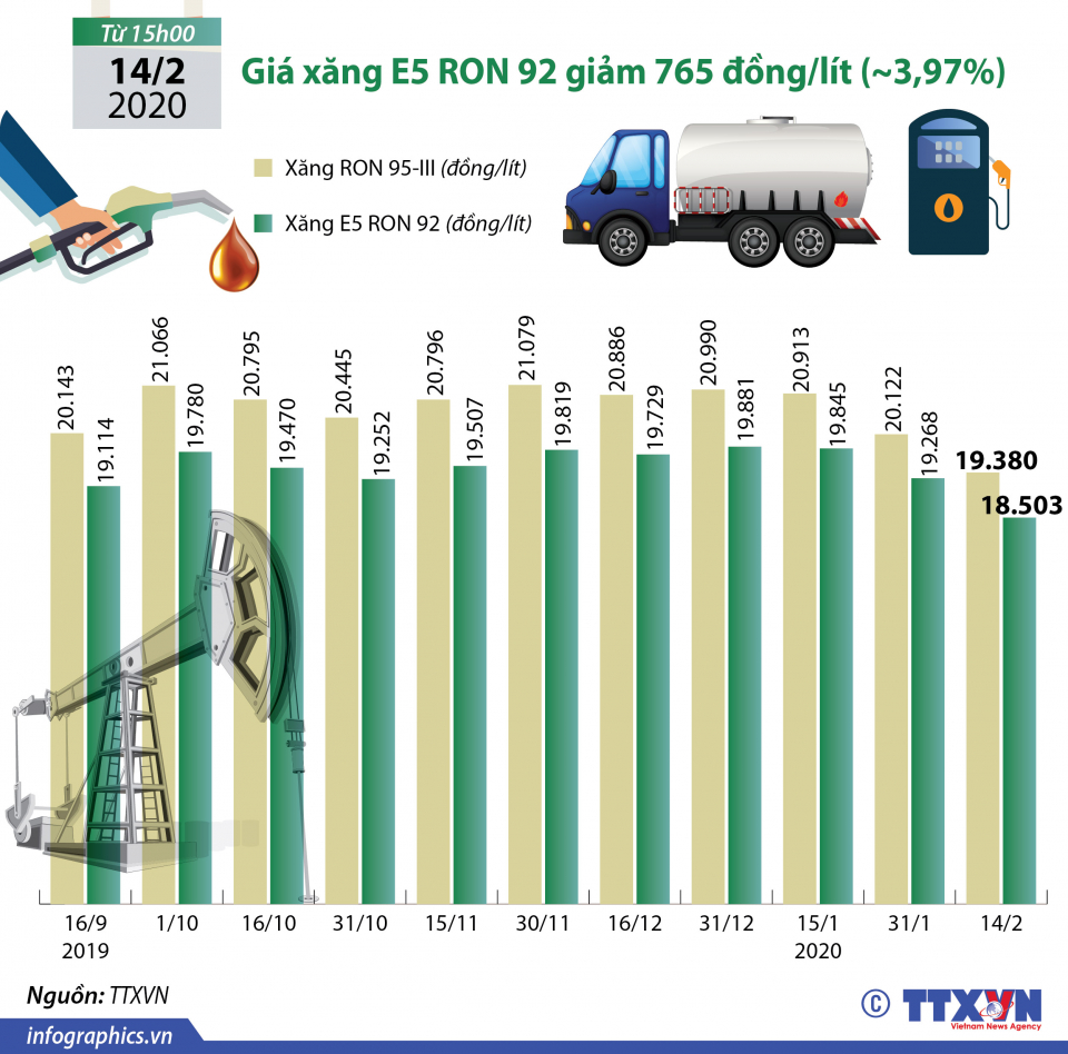 Từ 15h ngày 14/02/2020, giá xăng E5 RON 92 giảm 765 đồng/lít (tương đương 3,97%) xuống 18.503 đồng/lít, còn xăng RON95-III giảm 742 đồng/lít (tương đương 3,69%) còn 19.380 đồng/lít.