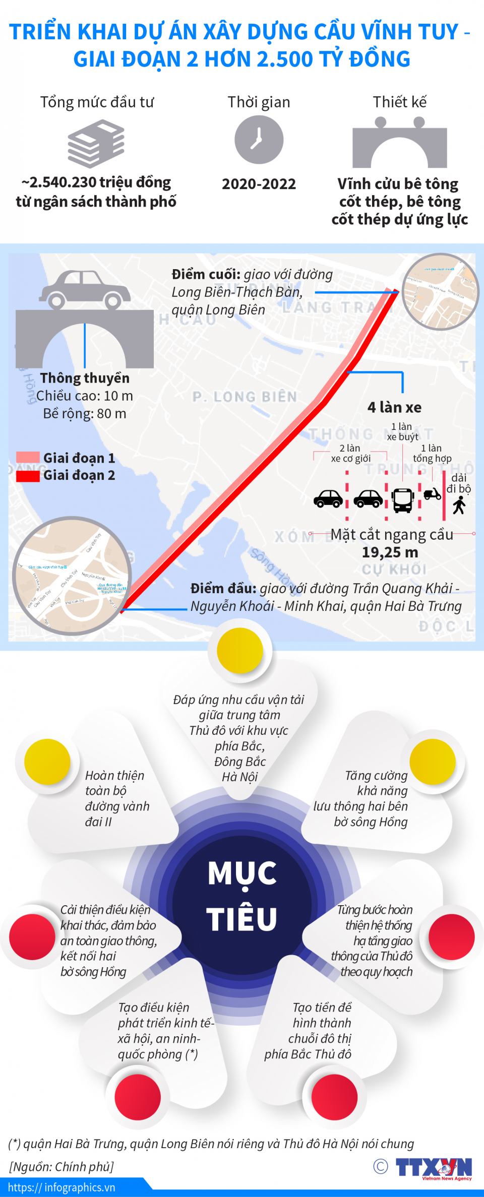 Phó Thủ tướng Trịnh Đình Dũng vừa ký Quyết định số 214/QĐ-TTg ngày 7/2/2020 phê duyệt chủ trương đầu tư Dự án đầu tư xây dựng cầu Vĩnh Tuy - giai đoạn 2 với tổng mức đầu tư hơn 2.500 tỷ đồng.