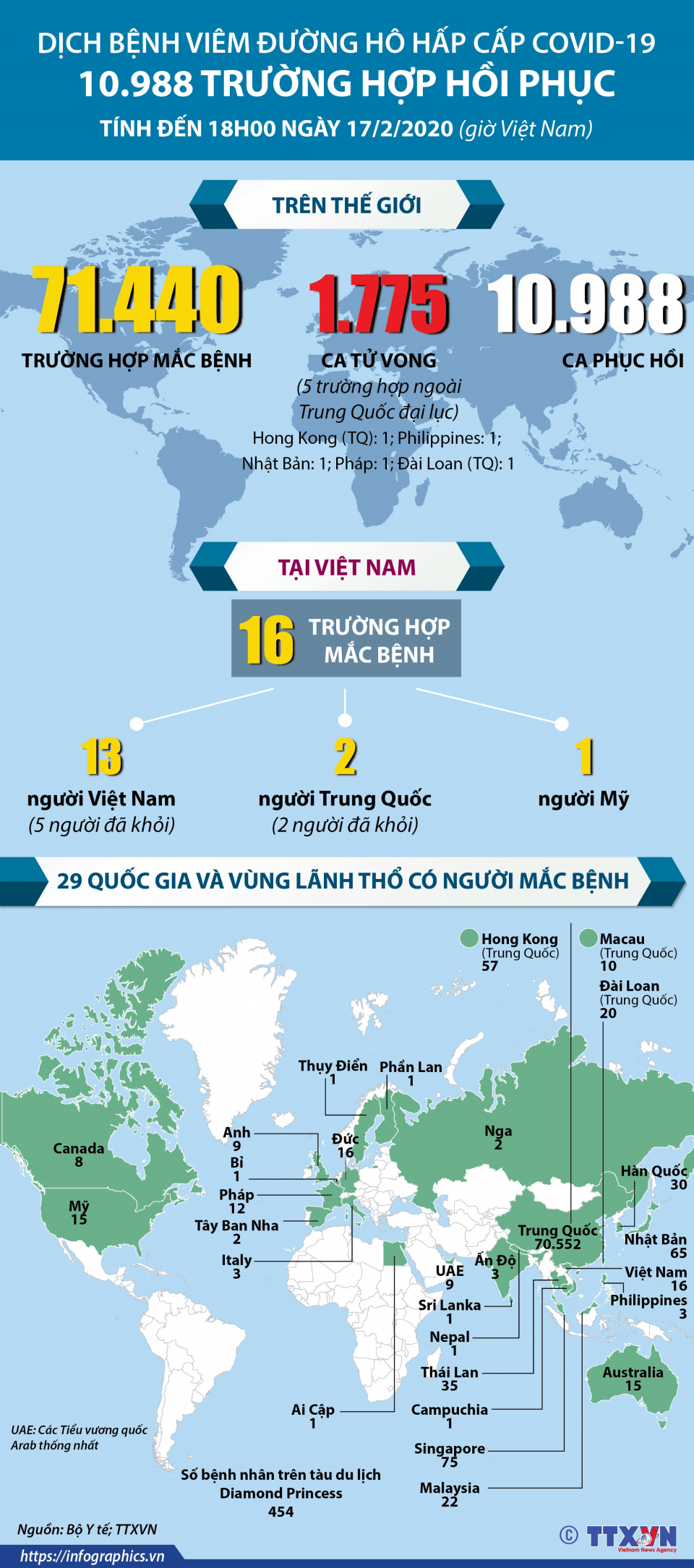 Đến 18h ngày 17/2/2020, đã có 71.440 ca mắc dịch bệnh viêm đường hô hấp cấp COVID-19 trên toàn thế giới và 1.775 người tử vong.