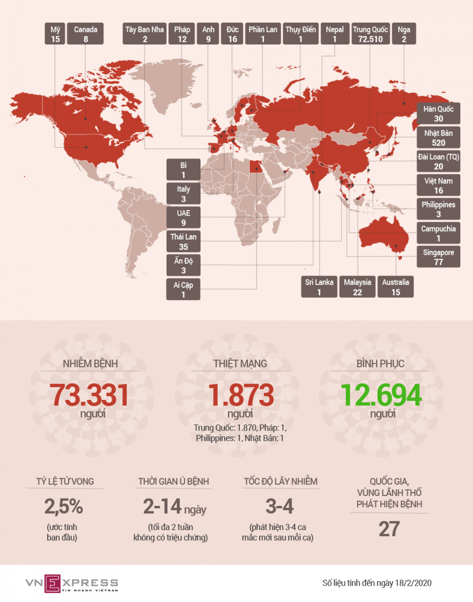 Dịch virus corona xuất hiện ở 27 quốc gia và vùng lãnh thổ, khiến hơn 73.000 người nhiễm bệnh, 1.873 người chết.