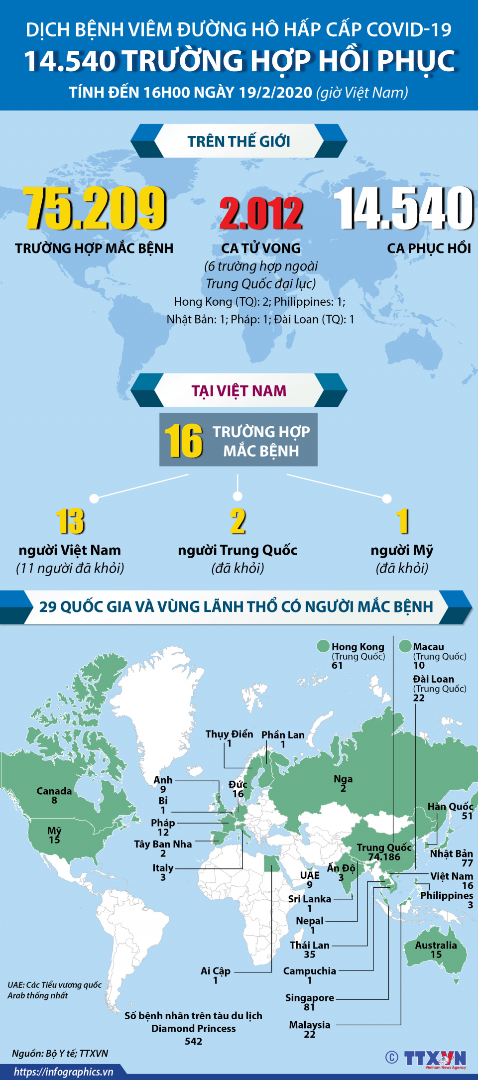 Đến 16h ngày 19/2/2020, đã có 75.209 ca mắc dịch bệnh viêm đường hô hấp cấp COVID-19 trên toàn thế giới và 2.012 người tử vong.