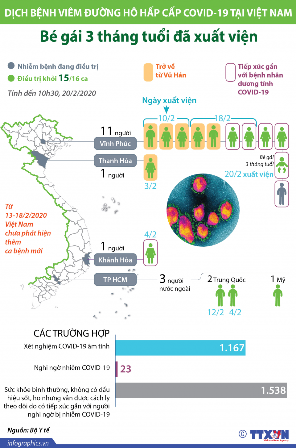 Theo thông tin từ Hệ thống giám sát dịch bệnh của Việt Nam, tính đến 20/2/2020, nước ta ghi nhận tổng số 16 trường hợp mắc bệnh viêm đường hô hấp cấp do chủng mới của virus corona (COVID-19), trong đó các bác sĩ đã điều trị khỏi 15 trường hợp.