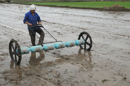 Nông dân xã Song An (Vũ Thư) gieo cấy lúa xuân bằng công cụ sạ hàng. Ảnh: Ngọc Linh