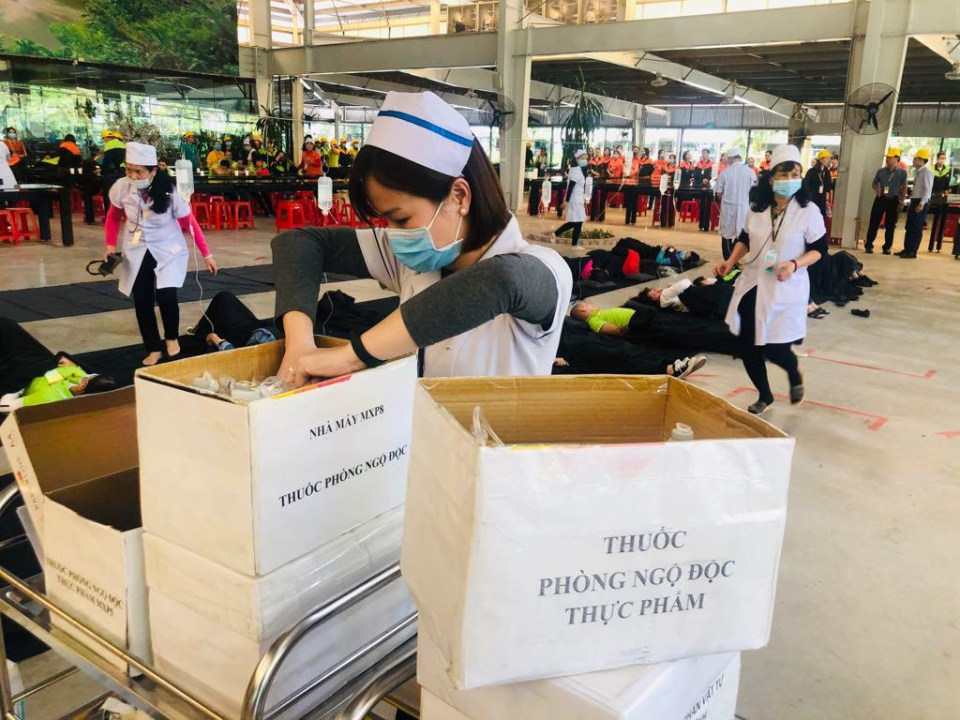 Nhà máy MXP1 tổ chức 2 bữa ăn trưa và tối hàng ngày, mỗi bữa thực hiện khoảng 2.600 suất ăn cho người lao động. Tình huống giả định đặt ra là sau giờ ăn trưa khoảng 1 giờ, có 15 công nhân tại phân xưởng 2 đến phòng y tế với triệu chứng đau bụng, đi ngoài phân lỏng và buồn nôn. Thông tin này được bộ phận y tế báo ngay cho phụ trách Phòng An toàn, nhân viên an toàn nhà máy đã có mặt để kết hợp tìm hiểu nguyên nhân. Theo báo cáo từ phân xưởng, tiếp tục có bệnh nhân có biểu hiện đau bụng đi ngoài, buồn nôn. Qua khám và kiểm tra sơ bộ tình trạng bệnh nhân, bác sĩ trực kết luận các bệnh nhân này đã bị ngộ độc thực phẩm. Xác định ngộ độc thực phẩm xảy ra, công tác cấp cứu lập tức được triển khai và thông báo, báo cáo kịp thời đến cơ quan chức năng. Trong 10 phút bệnh viện dã chiến đã hình thành với đầy đủ trang thiết bị cấp cứu, thảm nằm, gối, chăn, thuốc, nước truyền… Công nhân bị ngộ độc được các công nhân khác dìu đến và vận chuyển bằng cáng và xe lăn đến khu vực bệnh viện dã chiến. Cán bộ y tế tiến hành khám, phân loại bệnh nhân bằng thẻ với 3 mức đỏ, vàng, xanh tương ứng với các mức nặng nhẹ và phát túi nilon phòng nôn. Bệnh nhân nặng được liên hệ chuyển đến bệnh viện, bệnh nhân nhẹ được truyền nước, khám, phát thuốc điều trị tại chỗ…