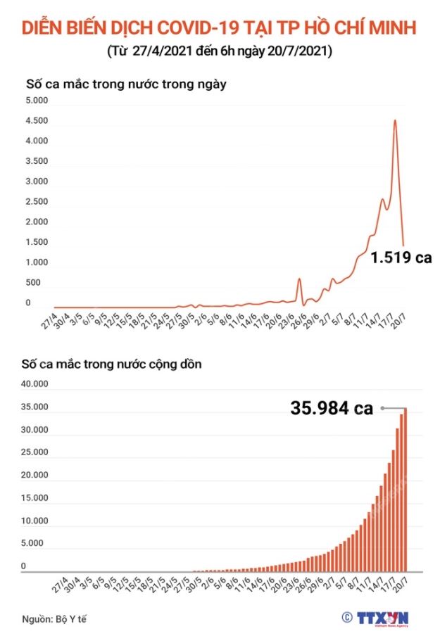 Tính đến 6h ngày 20/7/2021, TP Hồ Chí Minh ghi nhận thêm 1.519 ca mắc COVID-19 mới, nâng tổng số ca mắc lên 35.984 ca.
