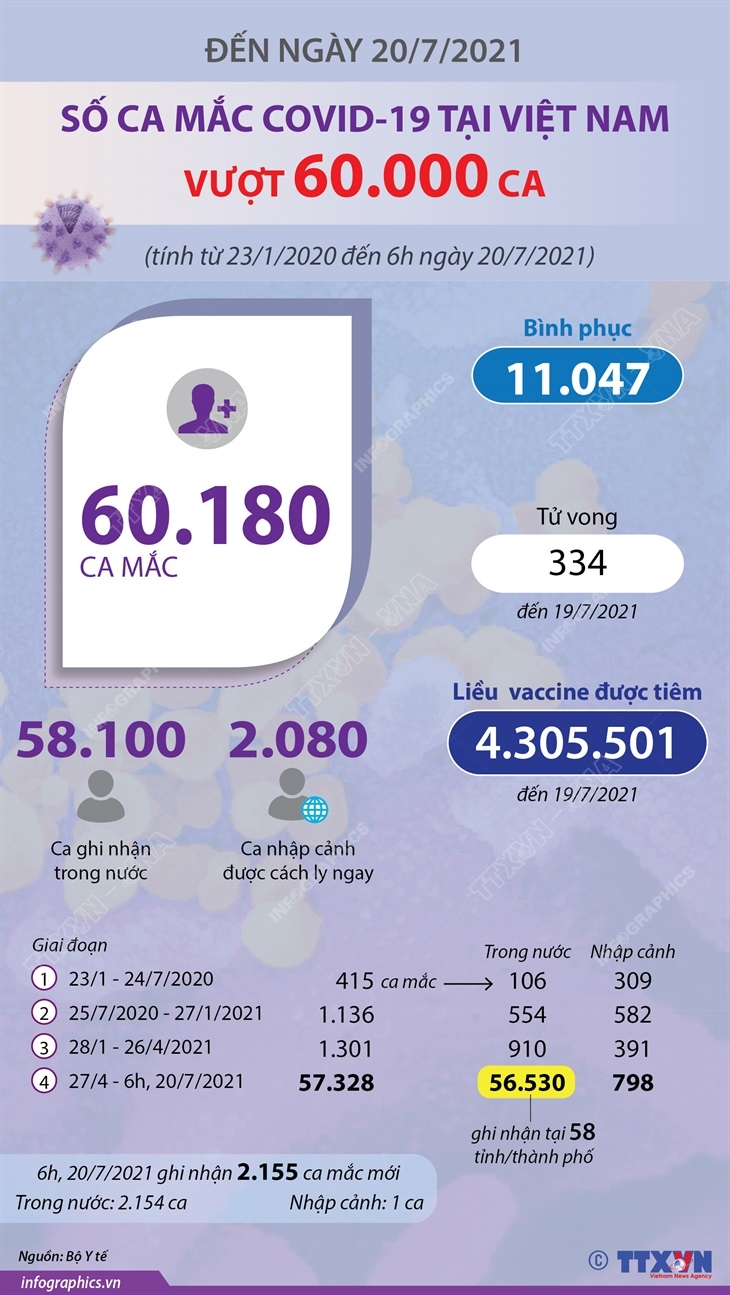 Tính từ 23/1/2020 đến 6h ngày 20/7/2021, số ca mắc COVID-19 của Việt Nam vượt 60.000 ca. Việt Nam hiện đã có tổng số 60.180 ca mắc COVID-19, trong đó có 58.100 ca ghi nhận trong nước và 2.080 ca nhập cảnh.