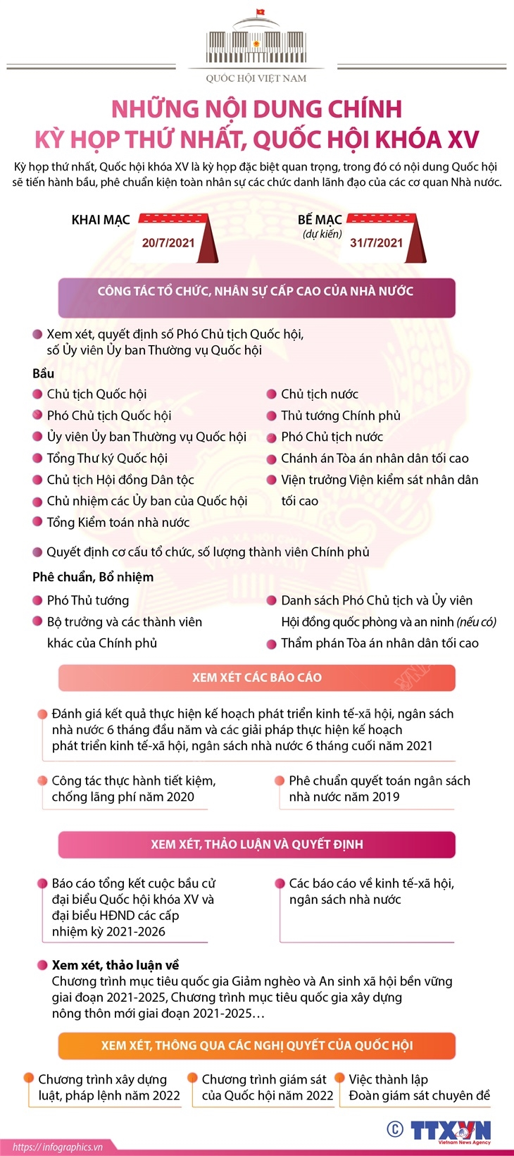 Kỳ họp thứ nhất, Quốc hội khóa XV là kỳ họp đặc biệt quan trọng, trong đó có nội dung Quốc hội sẽ tiến hành bầu, phê chuẩn kiện toàn nhân sự các chức danh lãnh đạo của các cơ quan Nhà nước. Dự kiến Kỳ họp diễn ra từ ngày 20-31/7/2021 tại Hà Nội.