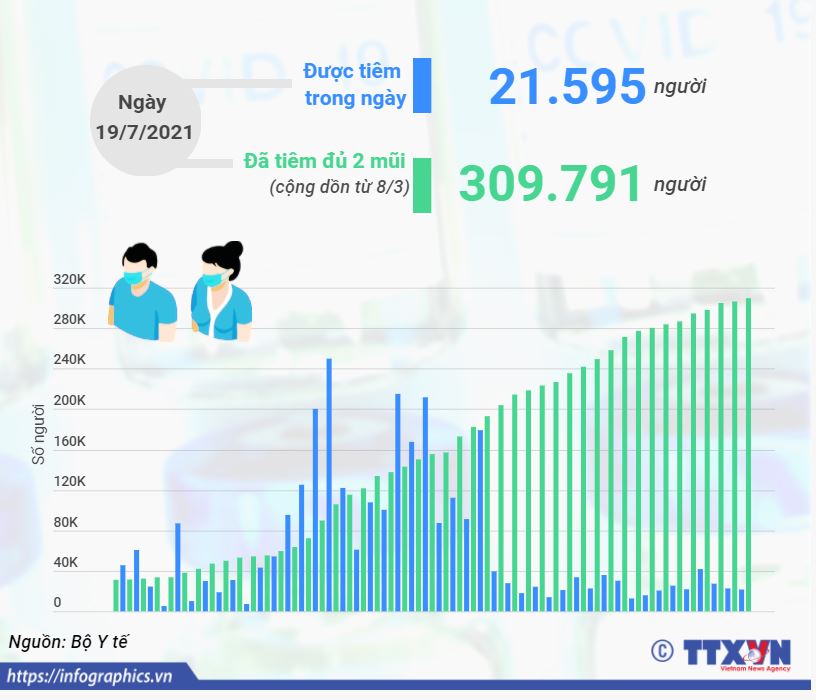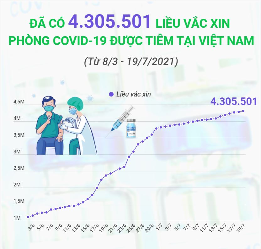 Tính đến ngày 19/7/2021, Việt Nam đã thực hiện tiêm 4.305.501 liều vaccine phòng COVID-19. Trong số đó, 3.995.710 người được tiêm 1 mũi và 309.791 người được tiêm đủ 2 mũi.