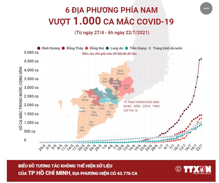 Ngoài TP Hồ Chí Minh, hiện 5 địa phương phía Nam có ca mắc COVID-19 vượt con số 1.000 là Bình Dương, Đồng Tháp, Đồng Nai, Long An và Tiền Giang. Các địa phương này đều đang giãn cách xã hội theo Chỉ thị 16 của Thủ tướng Chính phủ.