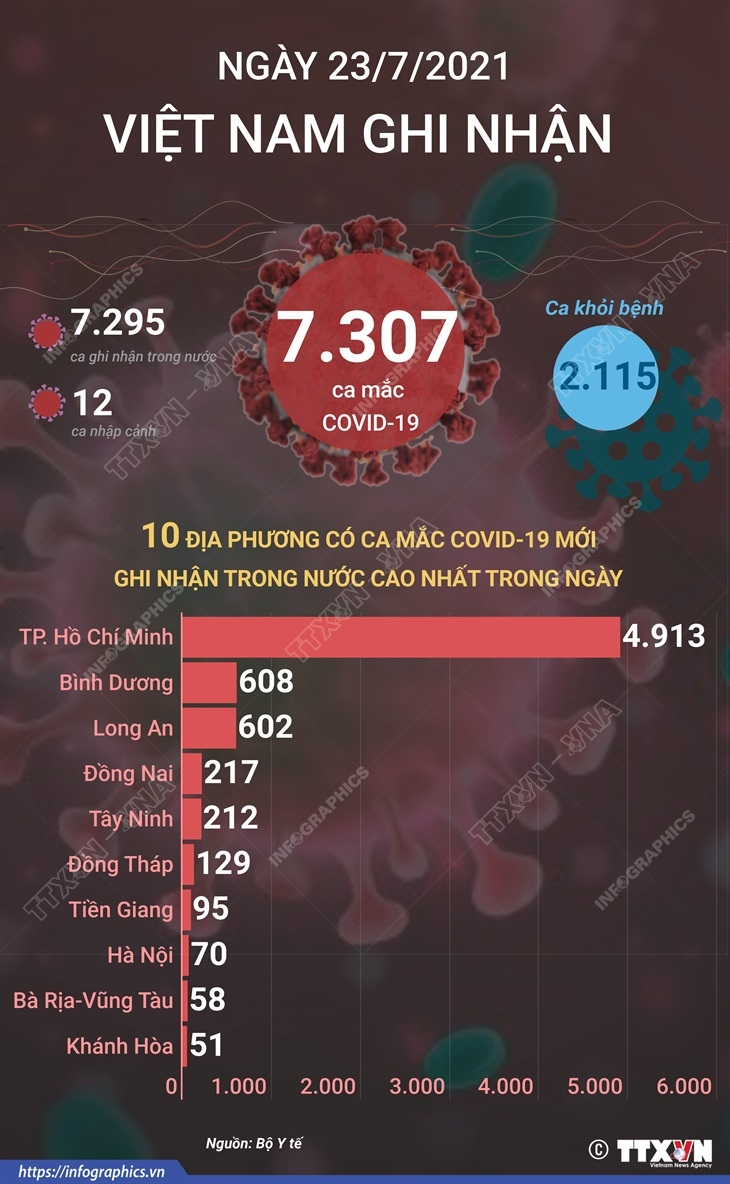 Ngày 23/7/2021, Việt Nam ghi nhận thêm 7.307 ca mắc mới, trong đó TP Hồ Chí Minh có số ca mắc COVID-19 nhiều nhất là 4.913 ca, Bình Dương 608 ca, Long An 602 ca, Đồng Nai 217 ca, Tây Ninh 212 ca, Đồng Tháp 129 ca, Tiền Giang 95 ca, Hà Nội 70 ca, Bà Rịa-Vũng Tàu 58 ca,.... Có 2.115 bệnh nhân mắc COVID-19 được công bố khỏi bệnh.