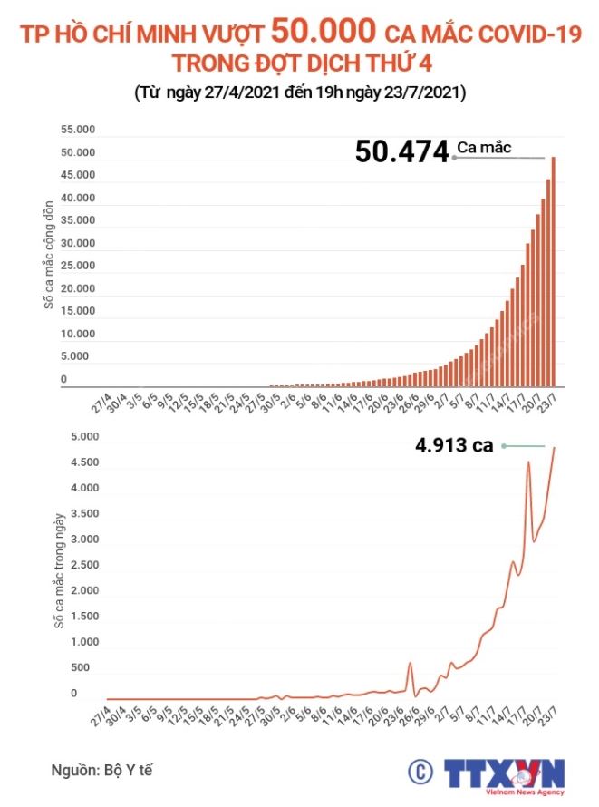 Với 4.913 ca mắc COVID-19 mới ngày 23/7/2021, Thành phố Hồ Chí Minh hiện ghi nhận 50.474 ca mắc trong đợt dịch thứ 4.