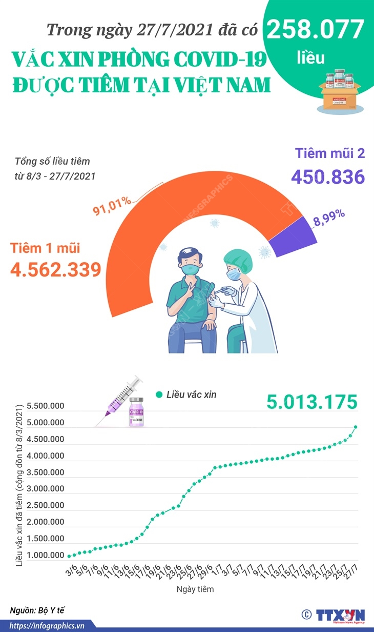 Trong ngày 27/7/2021 có 258.077 liều vắc xin phòng COVID-19 được tiêm. Đến nay, tổng số liều vắc xin đã được tiêm tại Việt Nam là 5.013.175 liều, trong đó tiêm 1 mũi là 4.562.339 liều, tiêm mũi 2 là 450.836 liều chiếm 8,99%.