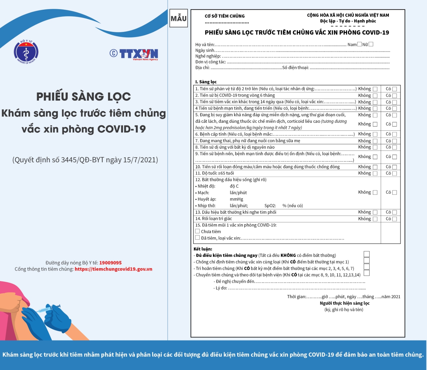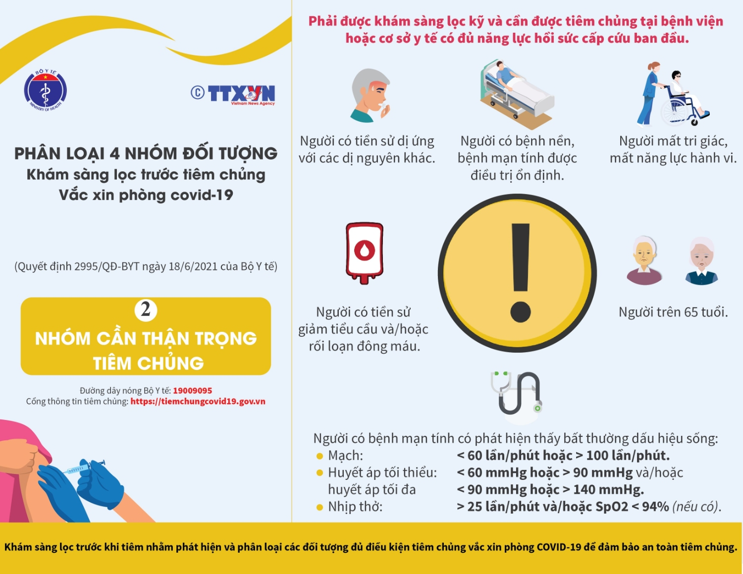 Ngày 28-7, Bộ Y tế phối hợp với Thông tấn xã Việt Nam thực hiện và cho ra mắt các infographic hướng dẫn người đi tiêm tự theo dõi sức khỏe sau tiêm chủng và phân loại 4 đối tượng trong khám sàng lọc trước tiêm chủng vắc xin phòng Covid-19 để người dân tìm hiểu, thực hiện.