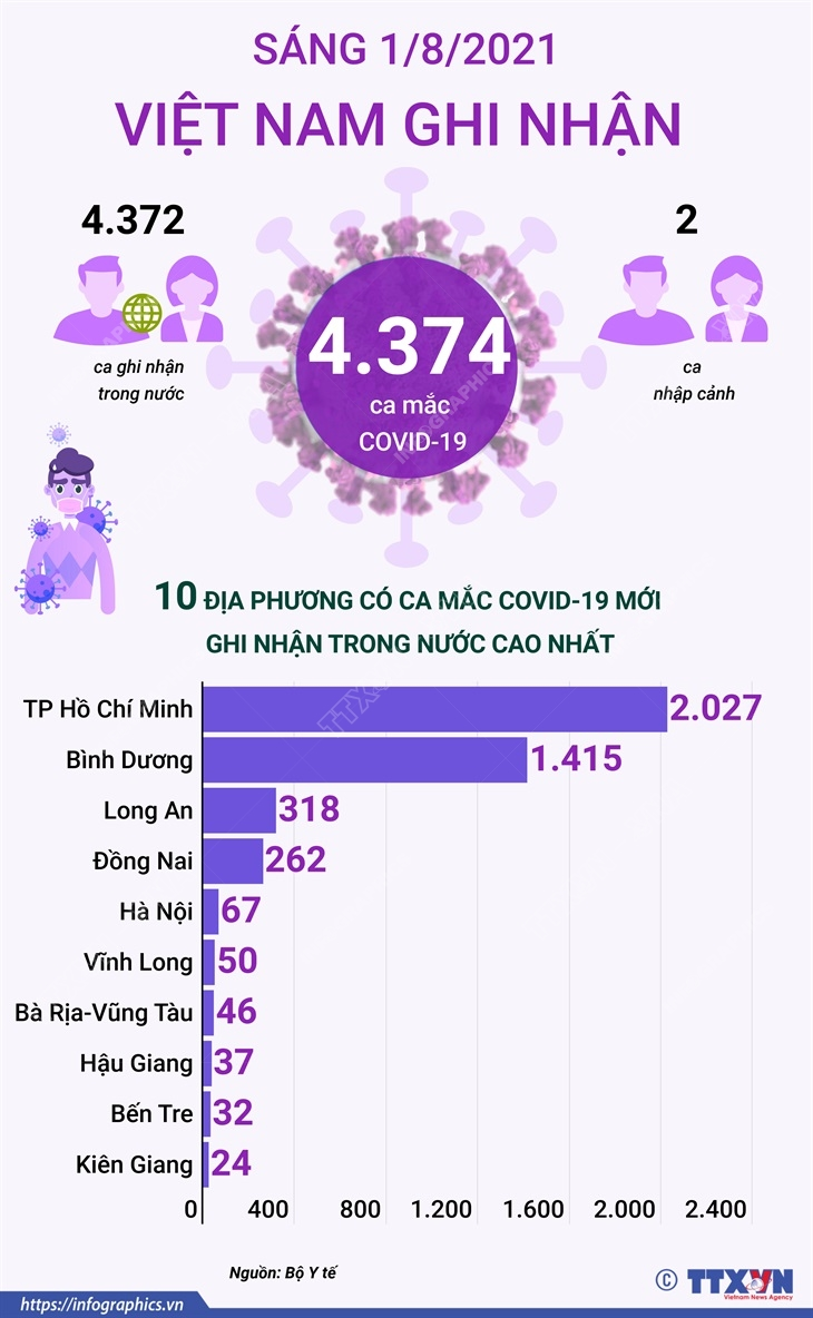Tính từ 19h ngày 31/7 đến 6h ngày 1/8/2021, Việt Nam ghi nhận 4.374 ca mắc COVID-19 mới, trong đó 2 ca nhập cảnh và 4.372 ca ghi nhận trong nước. Tại TP Hồ Chí Minh 2.027 ca, Bình Dương 1.415 ca, Long An 318 ca, Đồng Nai 262 ca, Hà Nội 67 ca, Vĩnh Long 50 ca, Bà Rịa-Vũng Tàu 46 ca, Hậu Giang 37 ca, Bến Tre 32 ca...
