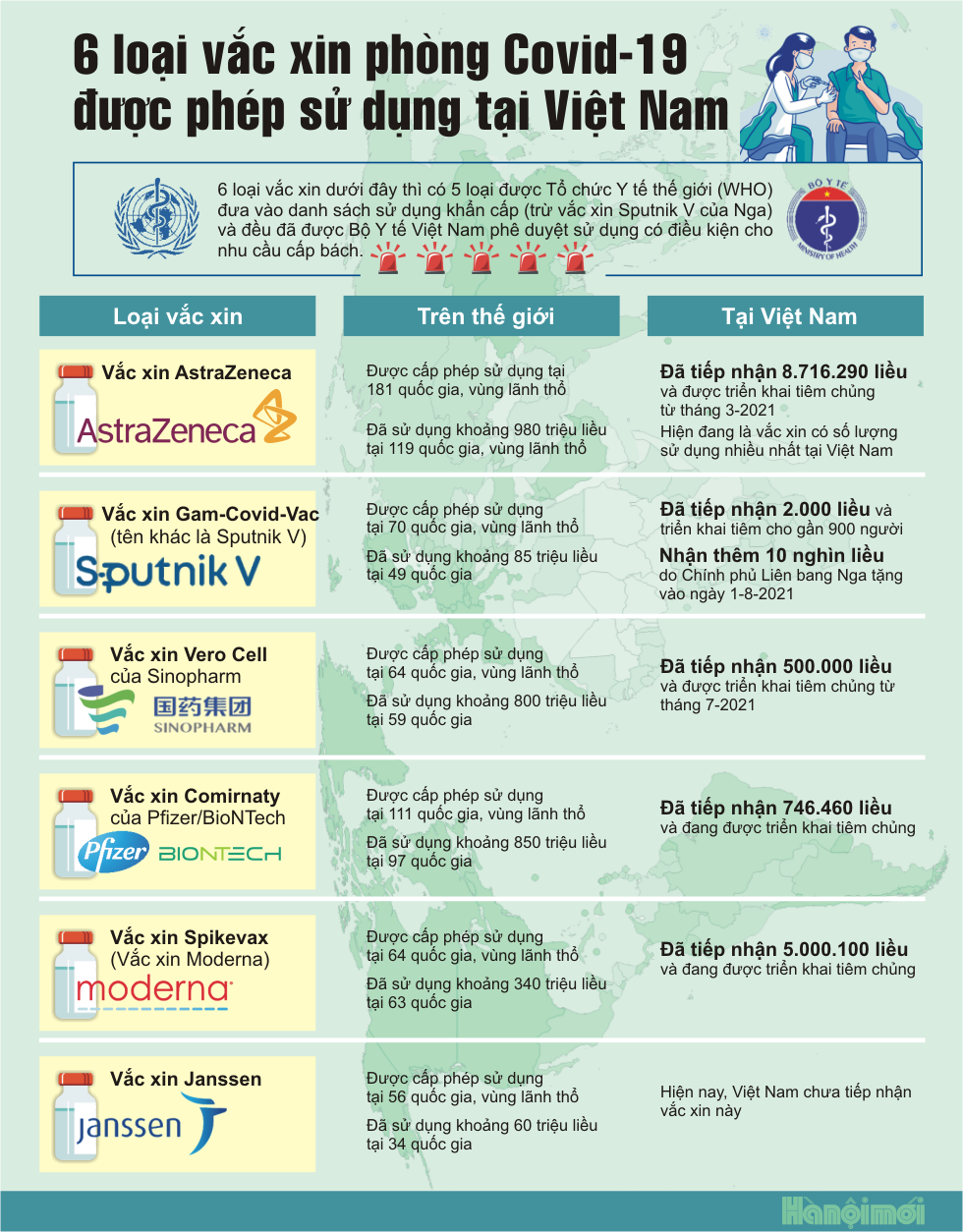 Cho đến thời điểm hiện tại, Việt Nam đã có 6 loại vắc xin phòng Covid-19 đã được Bộ Y tế cấp phép sử dụng. Cả 6 loại vắc xin này đều bảo đảm an toàn và hiệu quả.